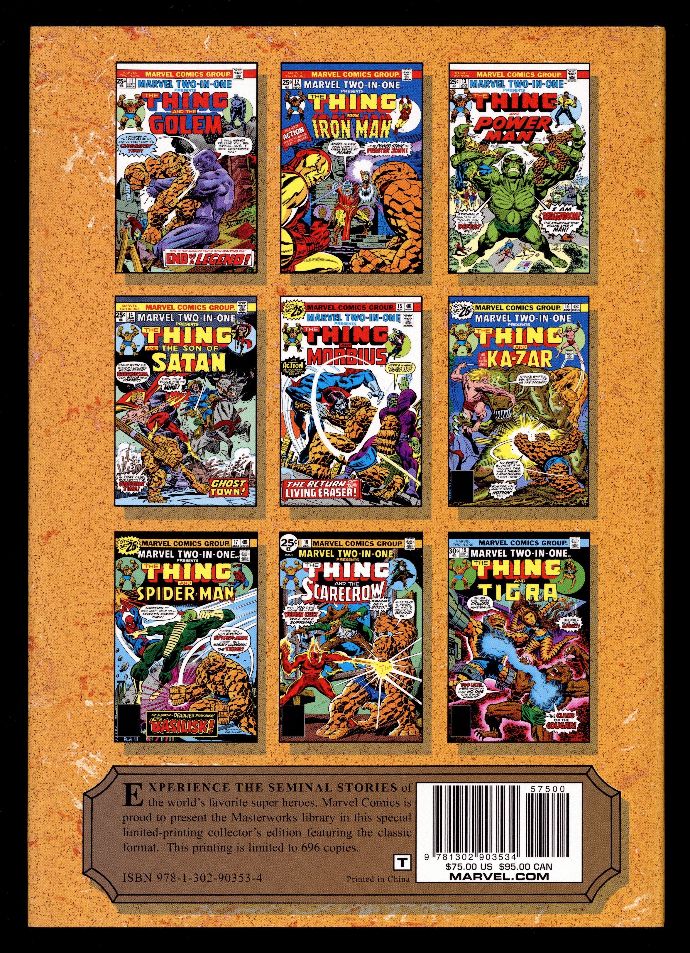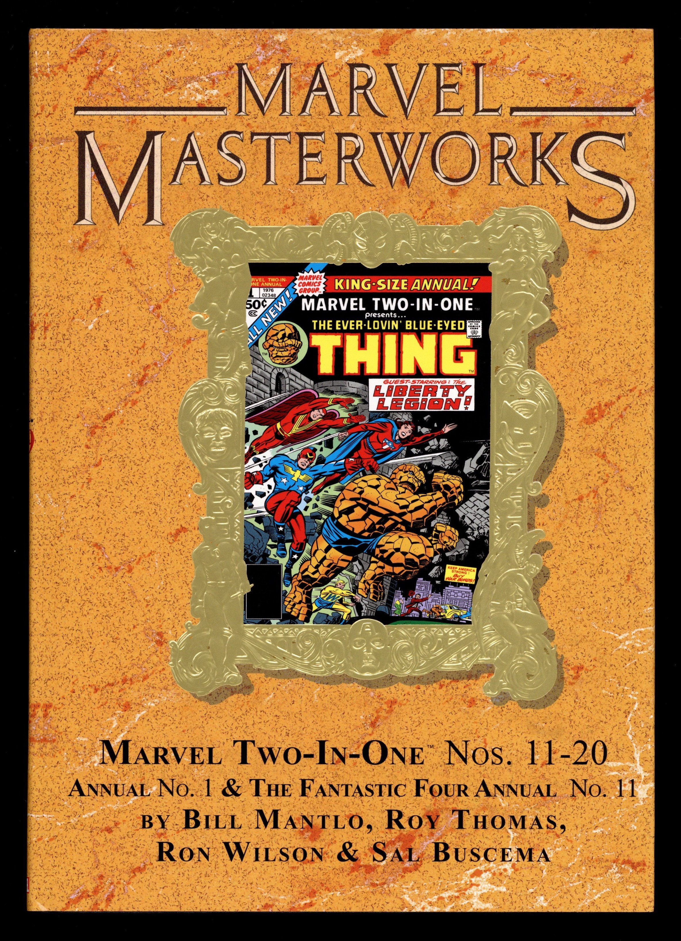 Volume 249 - 1st printing. "Marvel Two-in-One: Book 2!" Collects Marvel Two-in-One (1974-1983 1st Series) #11-20 and ANNUAL #1, Marvel Team-Up (1972-1985 1st Series) #47 and FANTASTIC FOUR ANNUAL #11. Written by Roy Thomas, Bill Mantlo, Roger Slifer, Len Wein, and Tony Isabell. Art by Bob Brown, Ron Wilson, Herb Trimpe, Arv Jones, Sal Buscema, and John Buscema. Cover by Arvell M. Jones. Whether it's heroes looking to team up or villains trying to test their mettle, everybody loves an adventure with the ever-lovin' blue-eyed Thing! And we have no doubt you'll love the adventures this volume has in store. With Luke Cage, the Thing fights the giant monster Braggadoom! With Iron Man, he encounters the mythical hero Prester John! With the Golem, Son of Satan and the Scarecrow, murderous demons are conjured! With Morbius, it's the return of the Living Eraser; with Ka-Zar, he lays a knuckle sandwich on a T. rex; with Spider-Man, it's a MTIO/MTU crossover classic - and with the FF, the Invaders and the Liberty Legion, the Thing travels back in time to World War II to battle the Third Reich! Hardcover, 288 pages, full color. NOTE: Limited to 696 copies. Cover price $75.00.