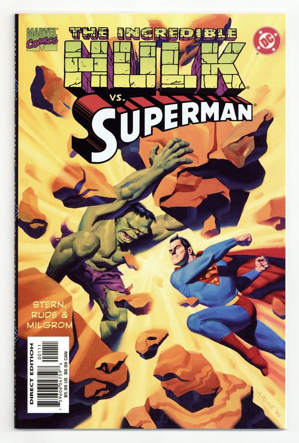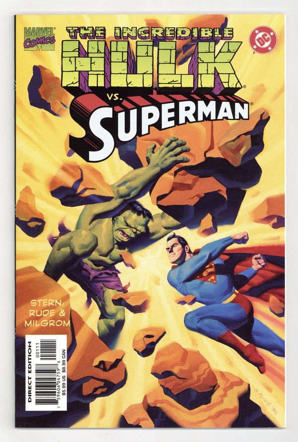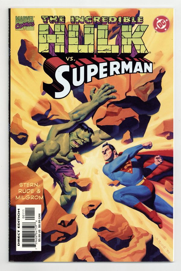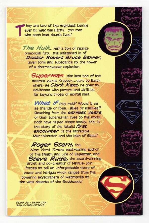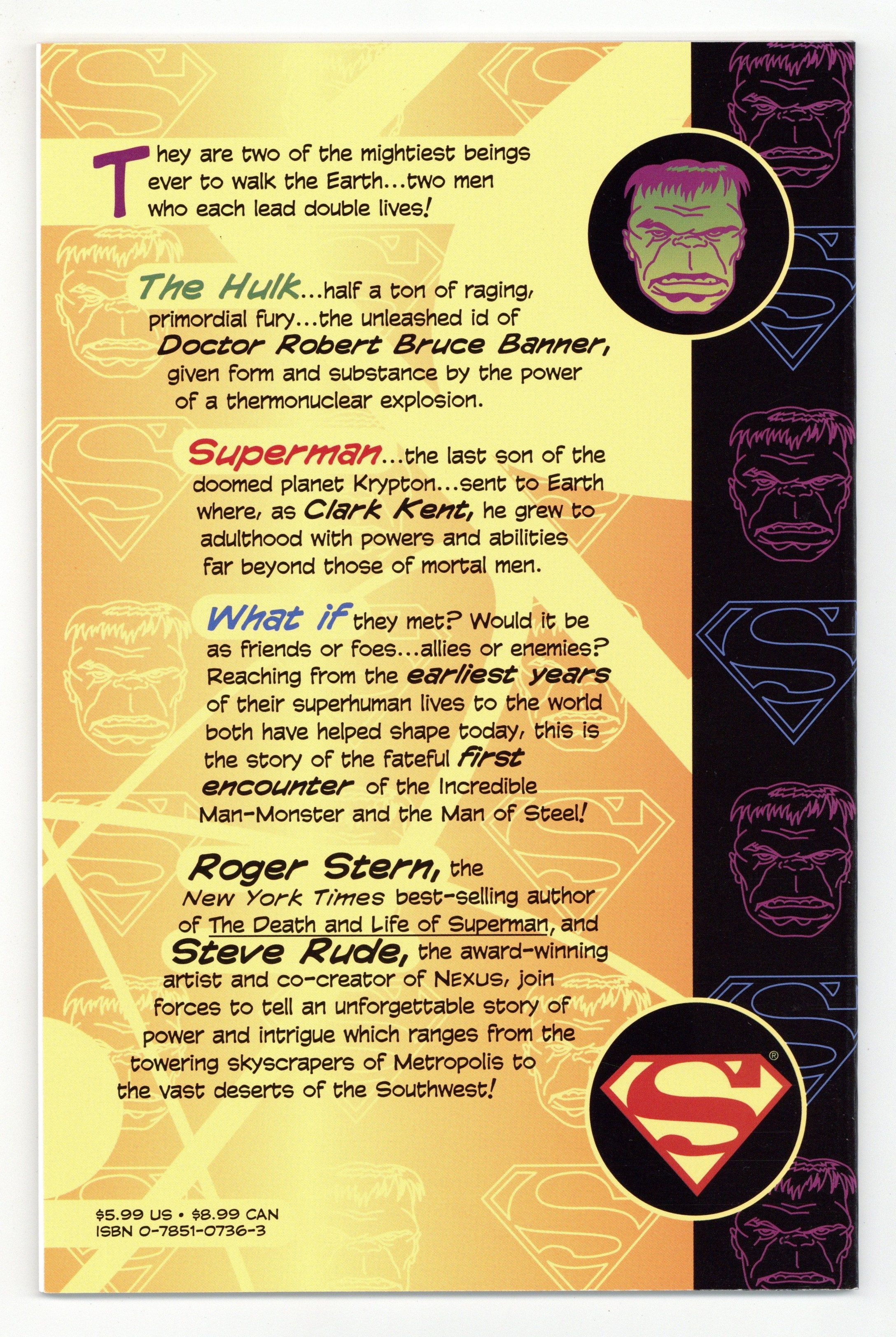 "Double Lives!" Story by Roger Stern. Art by Steve Rude and Al Milgrom. One is half a ton of primordial rage and fury and the product of modern science. The other is the last son of the doomed planet Krypton and endowed with abilities far beyond those of mortal men. Rendered in nostalgic 1950's-style artwork, this book tells the tale of "What if these two met?" What if these comic book icons had been born under the same banner? What will happen when the man-monster known as the Hulk, the strongest one there is, meets Superman, the Man of Steel and perhaps the greatest superhero of them all? Cover price $5.99.