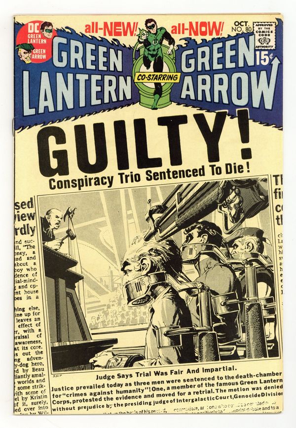 Cover art by Neal Adams. Even an Immortal Can Die!, script by Denny O'Neil, pencils by Neal Adams, inks by Dick Giordano and Mike Peppe (some incomplete figures); For putting the welfare of Green Lantern ahead of the ecological welfare of the planet Earth, the Guardians of the Universe send Old-Timer, accompanied by Green Lantern and Green Arrow as witnesses, to the planet Gallo to be judged by the Tribune. But when they are all muzzled and the Old-Timer is judged guilty without trial, the heroes realize that something is terribly wrong; They discover that the real Tribune have been replaced by their mechanic and fight to restore the proper process of justice and save the life of the Old-Timer. Letter to the editor from comic writer Don McGregor. 36 pgs. $0.15. Cover price $0.15.