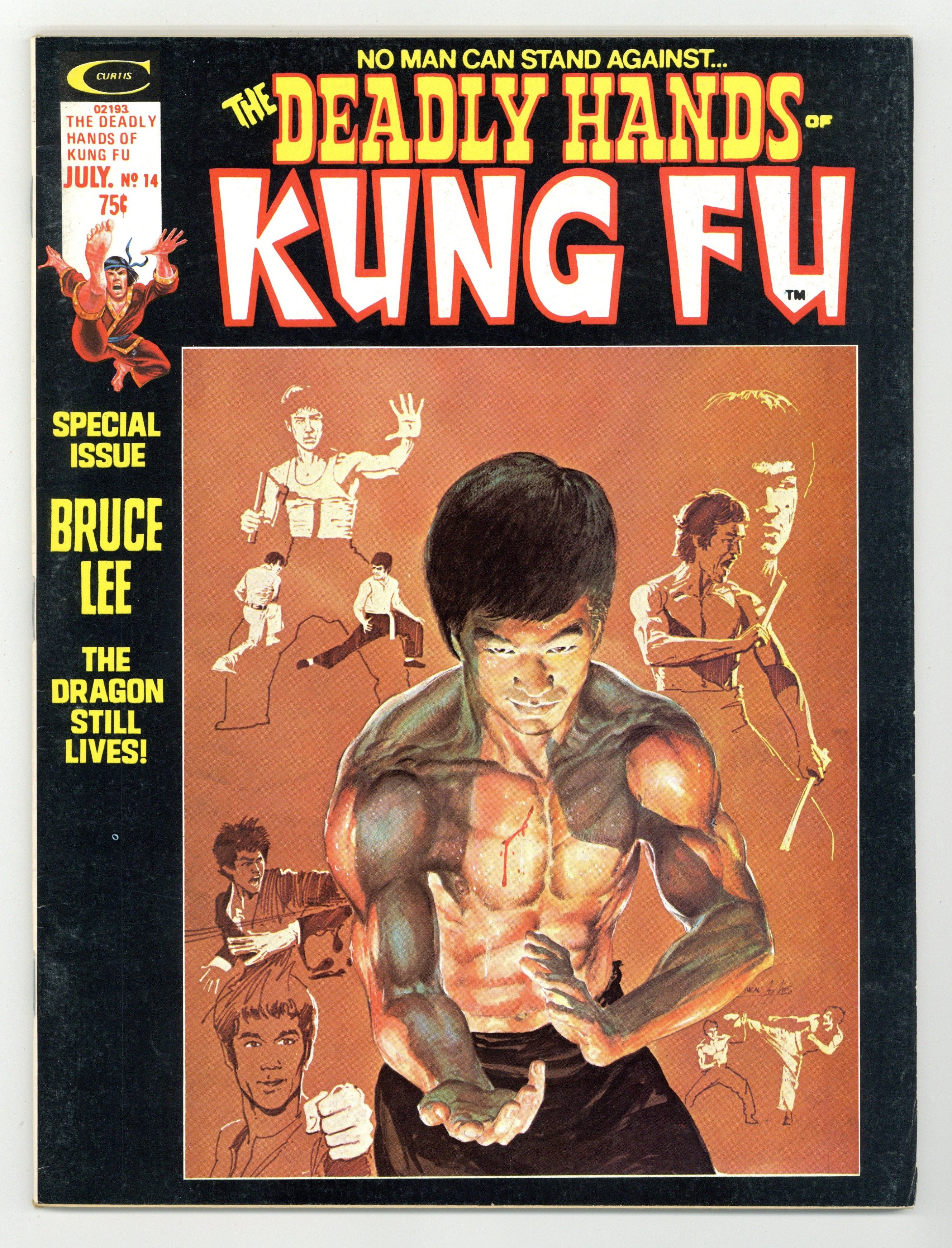 Stan Lee Presents: The Deadly Hands of Kung Fu. Special Bruce Lee issue. Cover by Neal Adams. Includes: "Enter the Letters!" A letters page with readers' thoughts on previous issues. Shang Chi, the Master of Kung Fu, stars in "Thief in Golden Shadows!" Story by Doug Moench. Art by Rudy Nebres. "Bruce Lee Again-For Better or Worse!" An article about the legendary martial artist by Wan Chang O'Shaungnessy. "The Art and Non-Science of Jeet Kune Do!" An article by James Glenn on the martial arts technique developed by Bruce Lee. "The Way of the Weapon!" An article on Bruce Lee's mastery of weapons in martial arts by Thomas Sciacca. Plus, the Sons of the Tiger star in "The Valley of the Ancestors!" Story by Bill Mantlo. Art by George Perez and San Adkins. Includes a B&W poster of Bruce Lee. Black and white. Cover price $0.75.