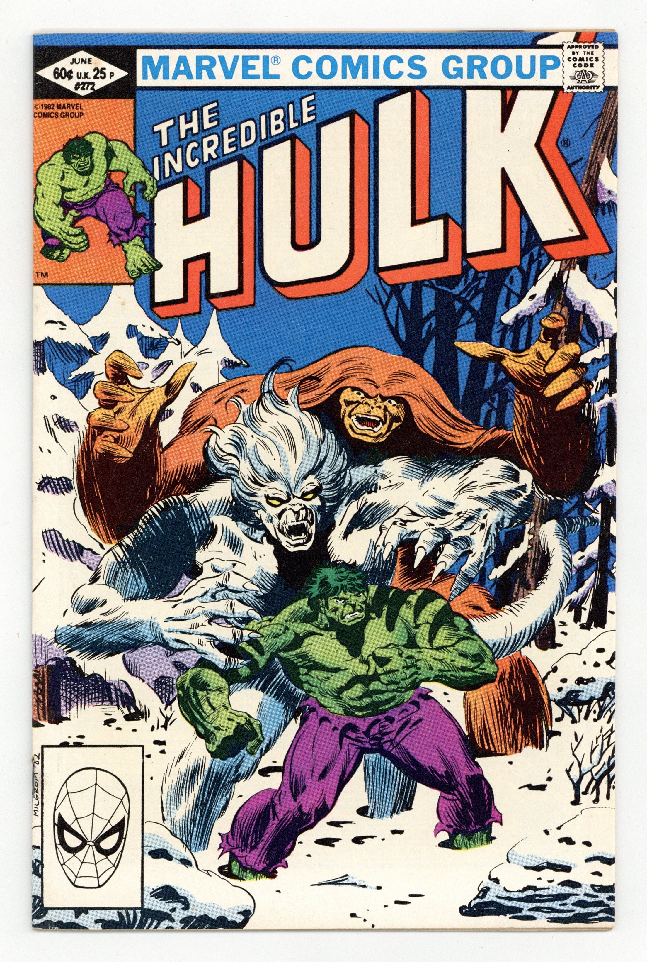 Tags: Marvel Legacy Numbering: Hulk (part 272), Hulk$35.00Direct Edition. "Weirdsong of the Wendigo!" Guest-starring Sasquatch. Alpha Flight cameo. Story by Bill Mantlo. Art by Sal Buscema. Bruce Banner arrives back on Earth, but must seek shelter quickly for he has landed in the Canadian wilderness in the middle of winter. Coming across a lone cabin, Banner soon discovers the remains of those murdered within. Then, he comes face-to-face with the horror responsible, the flesh eating Wendigo. Banner is startled as he realizes that his transformation is not triggered, and he is left at the mercy of this ravenous creature. Luckily the Sasquatch is on hand to help. However the Canadian hero will not last long against an opponent that has fought the Hulk to a stand still. Witness for the first time as Banner purposely triggers his transformation into the world's mightiest mortal and retains control over the Incredible Hulk. 36 pages. Cover price $0.60.