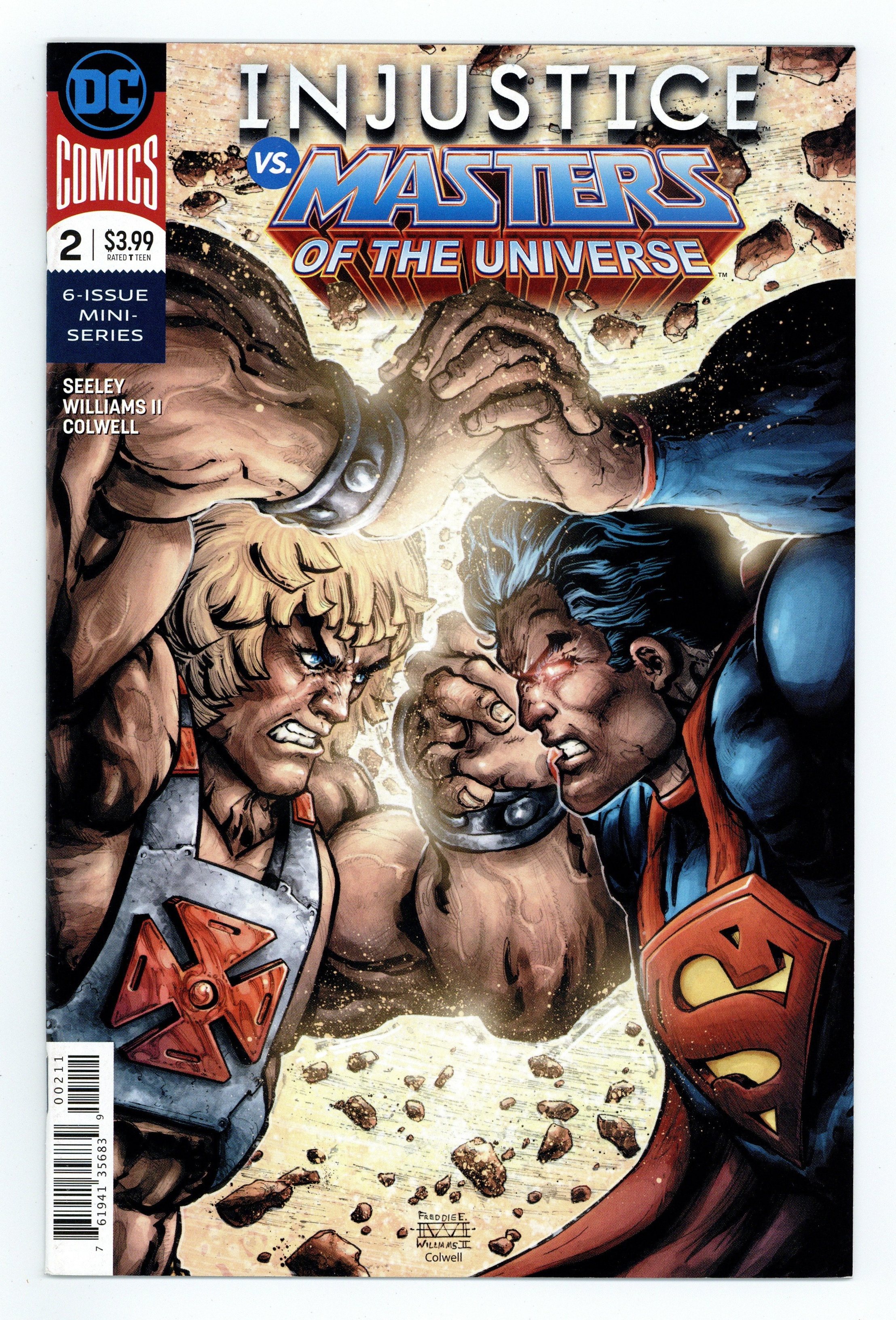 Written by Tim Seeley. Art and Cover by Freddie Williams II. He-Man has come to his mother's home-world to save it from a despotic ruler: Superman! As Batman plans an invasion of the Oracle to stop their suicide squads from terrorizing the populace, He-Man wanders an Earth city (in disguise) hoping to understand more of the difficulty they'll face. Meanwhile, back on Eternia, Zatanna and Swamp Thing are horrified to discover that someone else from their universe has crossed over! 32 pages, full color. Rated T Cover price $3.99.