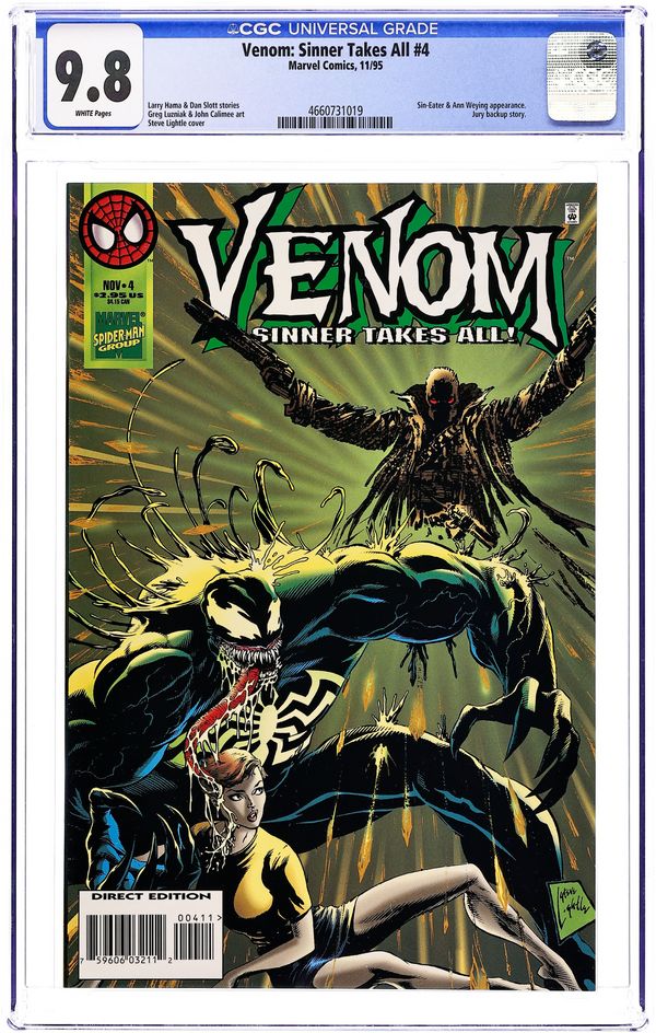 The new Sin-Eater makes Hannibal Lecter look like a little lamb--but now it's Venom's turn to feast! And what effect will Eddie's symbiote miracle-cure have on his ex-wife? Written by Larry Hama. Art by Greg Luzniak, Keith Aiken and Jeff Albrecht. Plus: bonus back-up story featuring the Jury. Cover by Steve Lightle. 48 pages. Cover price $2.95.