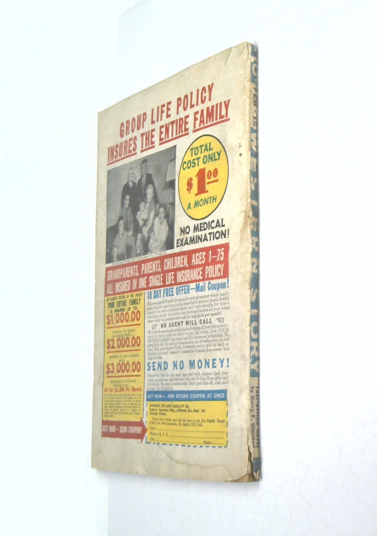 - Back cover detached 15%. Water damage: Moderate. Staple rust: Slight.