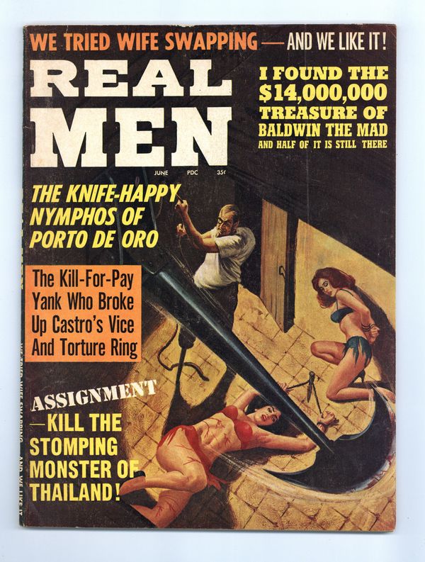 Vintage men's interest magazine that focuses on adventure short fiction stories, true crime, war updates, and pin-up photography. 8.5" x 11", 82 pages, B&W. Cover price $0.35.