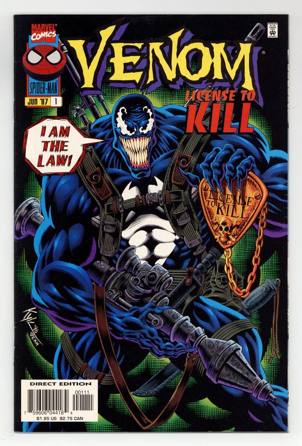 Tags: Marvel Legacy Numbering: Venom (part 54), Spider-Man$20.00An all-new status-quo for Venom starts here! After cutting a deal with Darryl Smith in Venom on Trial (1997) #3, Venom finds his criminal record expunged and himself a covert operative! Now he's a sanctioned hired gun, which spells big trouble for the heroes of the Marvel Universe! Written by Larry Hama. Art by Derec Aucoin, Ralph Cabrera and Rich Faber. Cover by Kyle Hotz. Cover price $1.95.