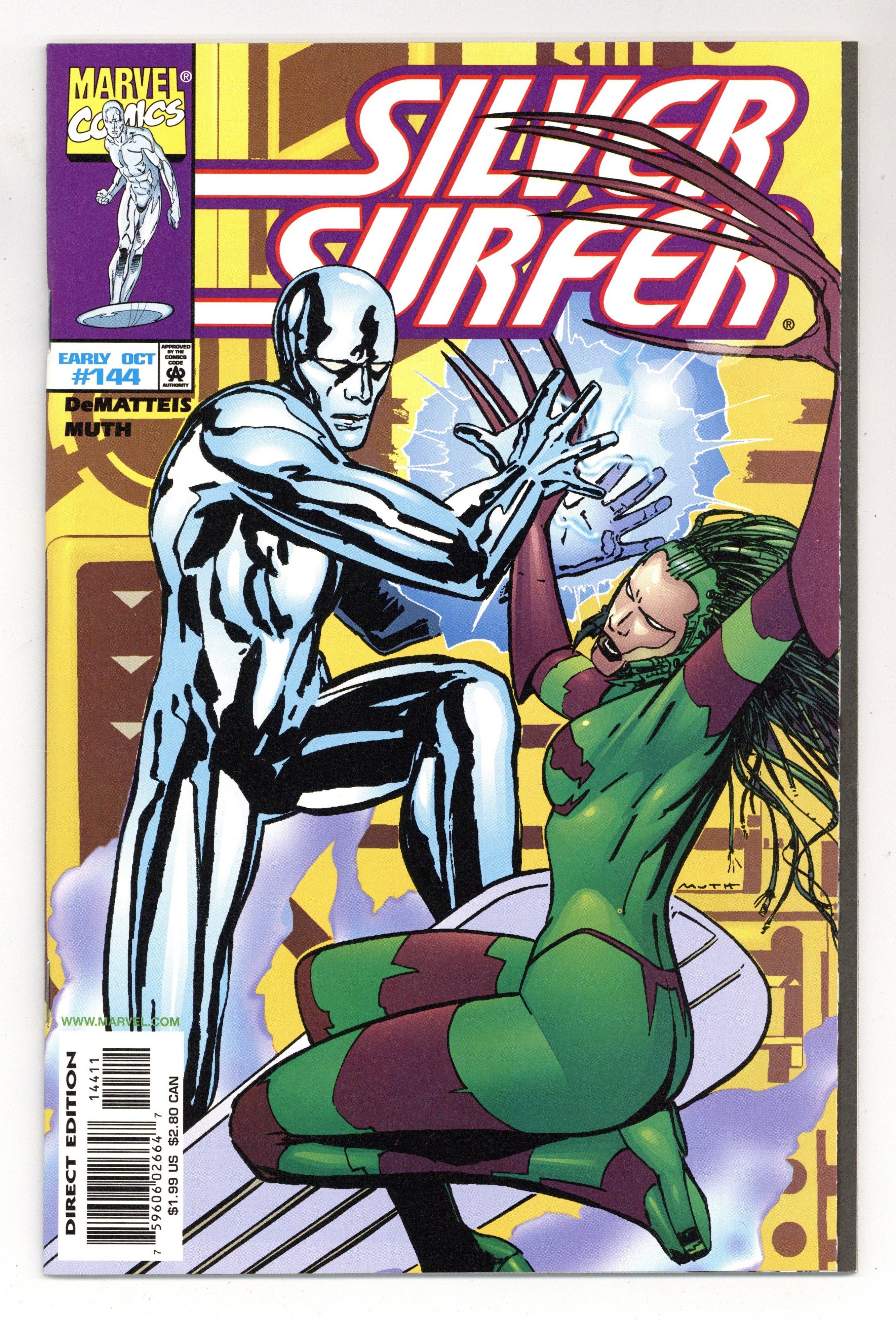 Tags: Silver Surfer$18.00"Couplings!" Story by J.M. DeMatteis. Art by Jon J. Muth. The Silver Surfer and Tenebrae are completely at the mercy of the diabolical Psycho-Man. Will these bitter enemies work together to escape or are they forever destined to try and destroy one another. Cover price $1.99.