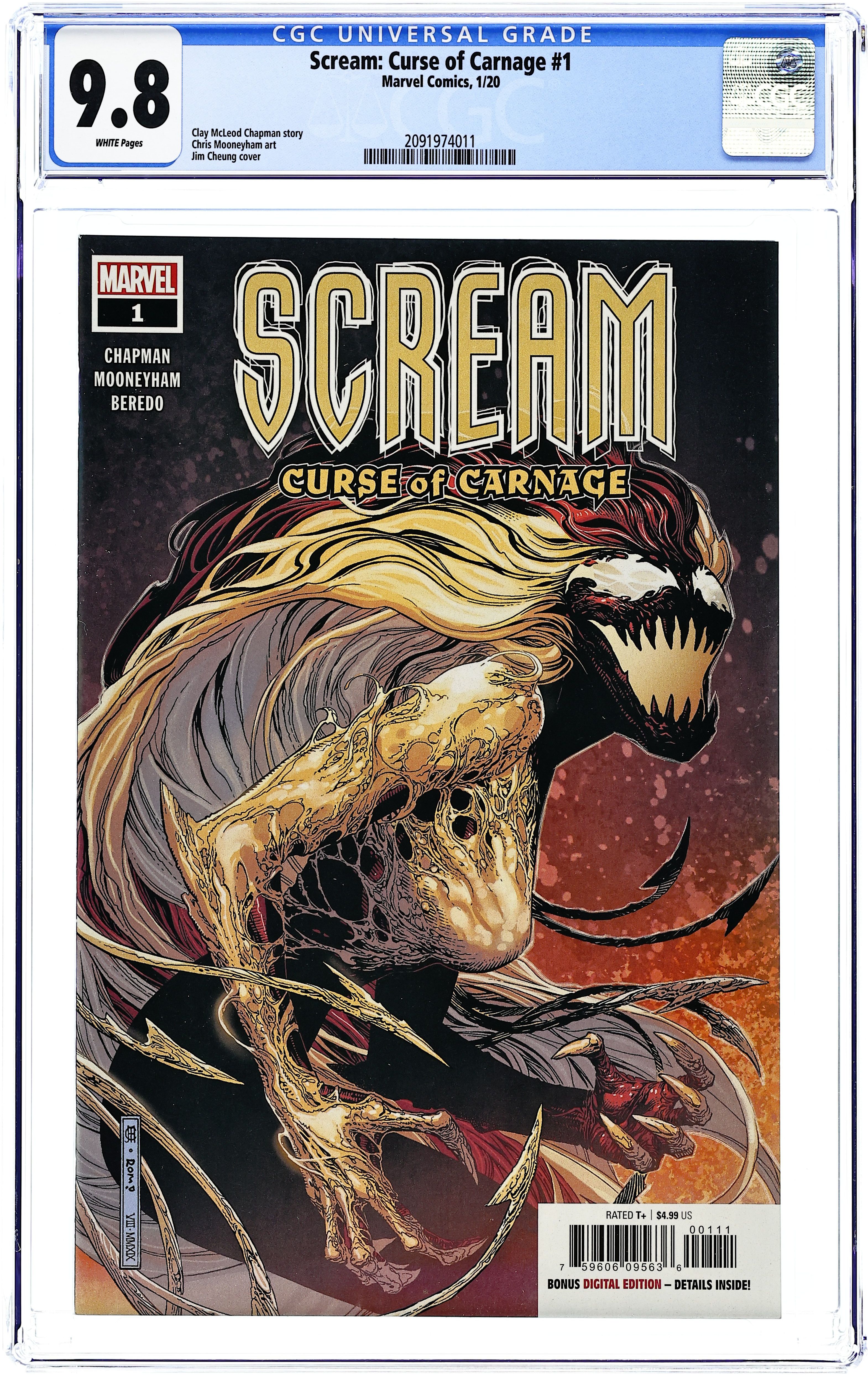 Written by Clay McLeod Chapman. Art by Chris Mooneyham. Cover by Jim Cheung. OUT OF THE ASHES OF ABSOLUTE CARNAGE! ALL-NEW ONGOING SERIES! Patricia Robertson, Andi Benton, Donna Diego… it's all been leading to this as one of the original - and possibly strongest - offspring of the Venom symbiote at last stars in her own, self-titled ongoing series set in the Marvel Universe! But after the events of ABSOLUTE CARNAGE, what remains of the Scream symbiote as it was before? Does it even have a host? What are their intentions? And what will a pair of web-slinging wallcrawlers have to say about it's presence in New York? 36 pages, full color. Rated T+ Cover price $4.99.