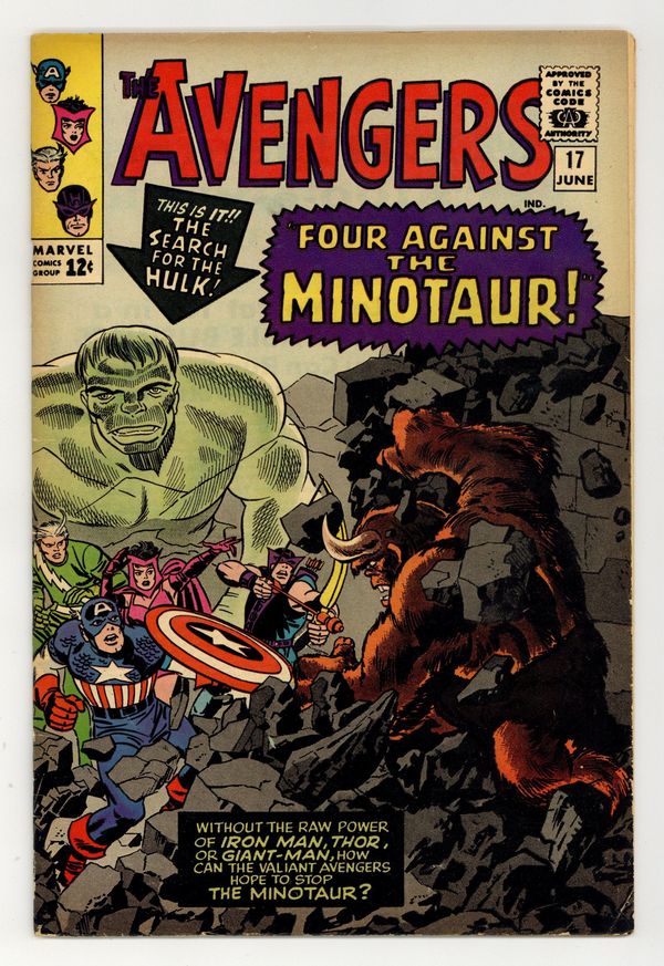 "Four Against the Minotaur!" Script by Stan Lee, pencils by Don Heck (some faces retouched by Jack Kirby), inks by Dick Ayers. Avengers Roll Call: Captain America, Hawkeye, Quicksilver, Scarlet Witch, and Rick Jones. Villains: the Mole Man, the Leader, and the first and only appearance of a minotaur. Guest appearance by the Hulk. As this and the story from Tales to Astonish 69 take place at the same time, some panels are reproductions of the Astonish panels. Reprinted in Marvel Triple Action # 11. Kirby/Frank Giacoia cover. 36 pgs. Cover price $0.12.