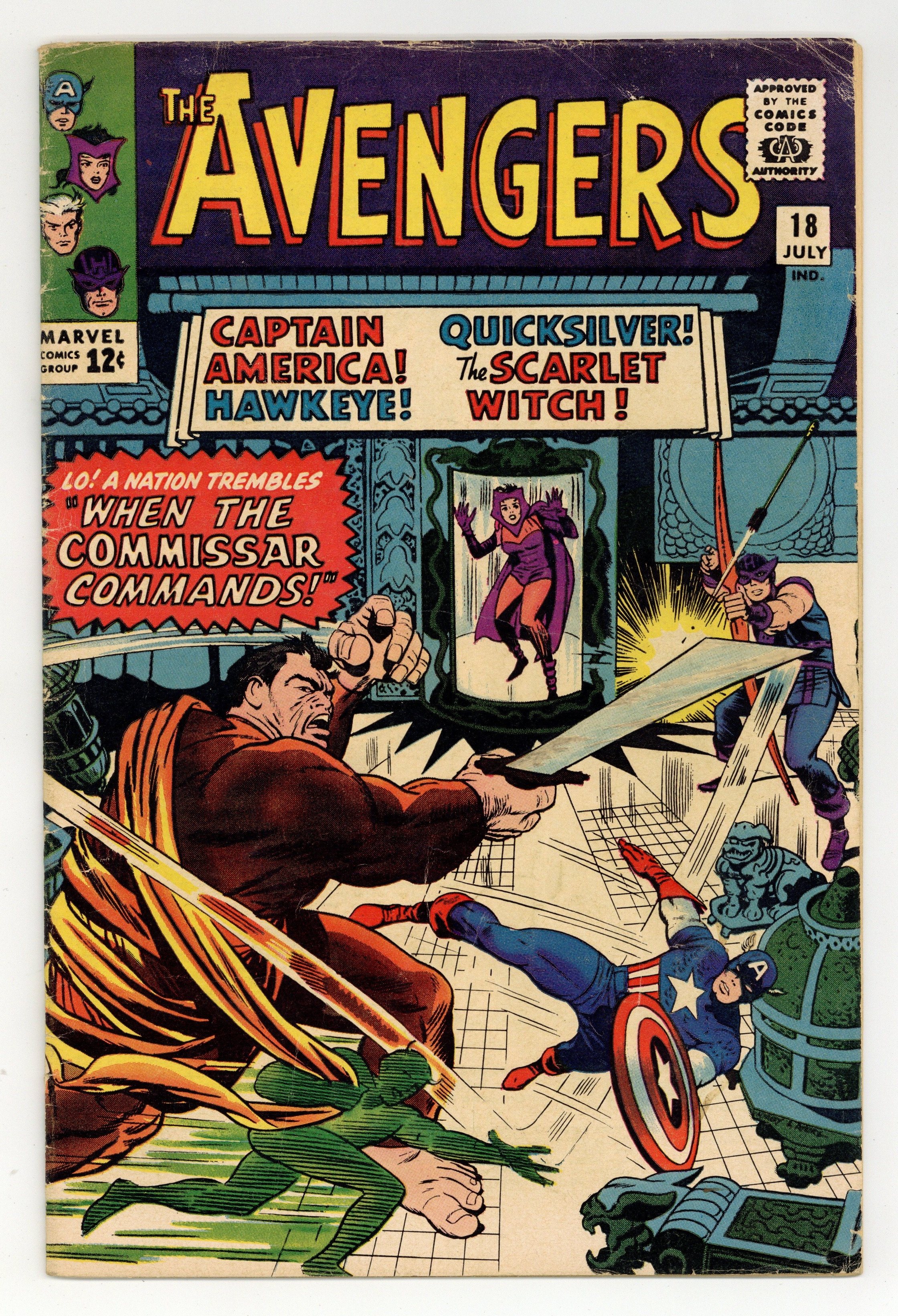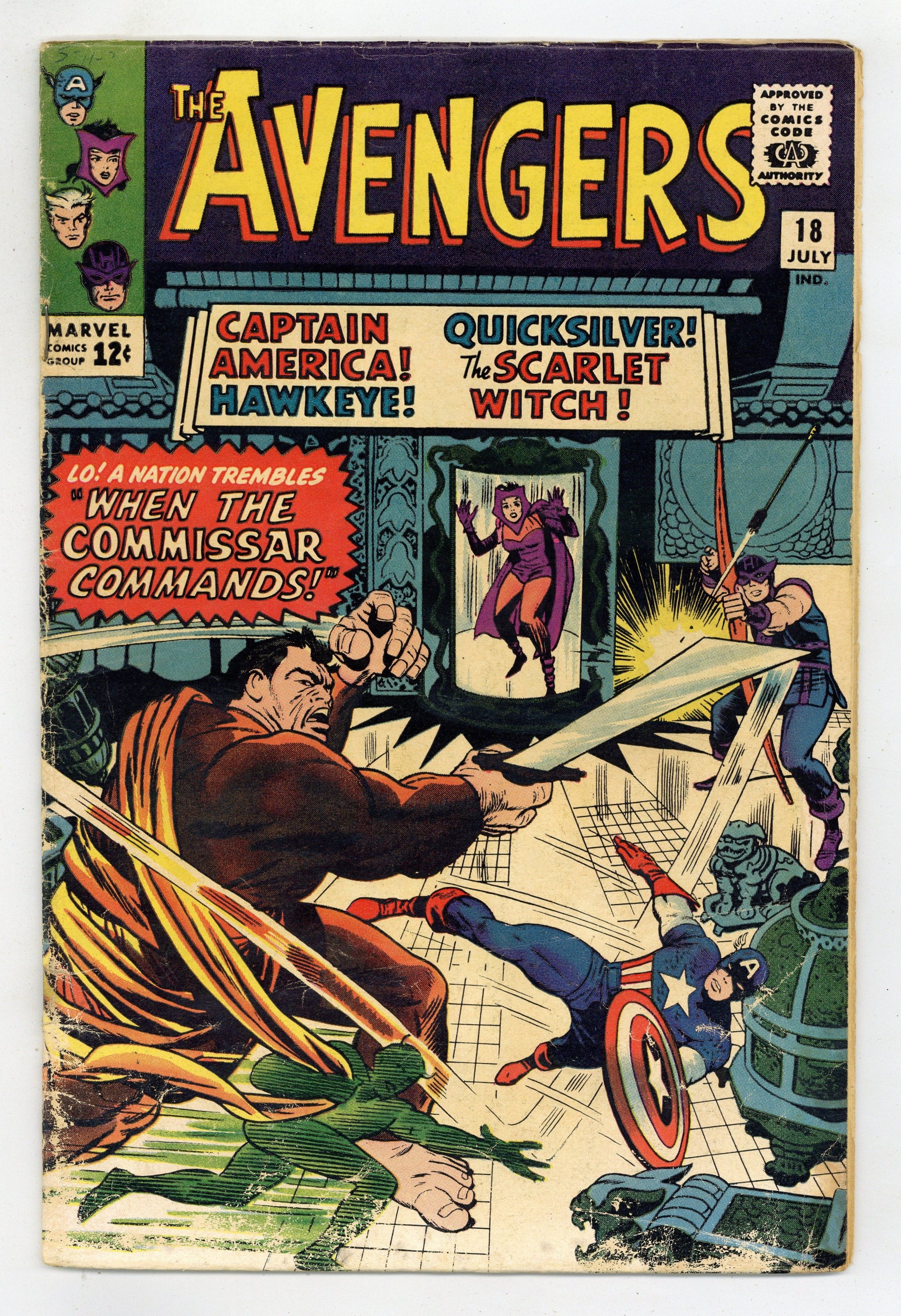 Cover pencils by Jack Kirby, inks by Dick Ayers. "When the Commissar Commands!", script by Stan Lee, pencils by Don Heck, inks by Dick Ayers; The Reds (evil commies) led by the monstrous Commissar are enslaving the peaceful land of Sin-Cong; The Avengers travel to that land to aid the people. Commissar defeats them all except the Scarlet Witch who discovers and destroys the Commissar's control panel, ending him. Avengers Roll Call: Captain America, Hawkeye, Quicksilver, and the Scarlet Witch. Appearance by Edwin Jarvis. Villains: Major Hoy and the Communists oppressors of Sin Cong (first and only appearance). Cameo by Nick Fury. Letter to the editor from Ted White (the writer?). Reprinted in Marvel Triple Action # 12. 36 pgs., full color. $0.12. Cover price $0.12.