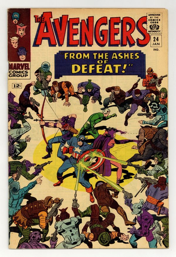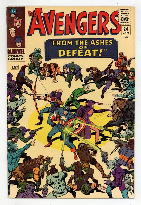 Tags: Marvel Legacy Numbering: Avengers (part 24), Avengers$47.00Cover pencils by Jack Kirby, inks by Dick Ayers. "From the Ashes of Defeat - !", script by Stan Lee, pencils by Don Heck, inks by Dick Ayers; Kang's troops advance on the city as Kang escapes; Although hopeless, the Avengers decide to put up a fight against the never-ending army; Quicksilver is put out of action by a stray blast while trying to help a mother and child; The rest of the Avengers battle on but are eventually overwhelmed and captured; Although Kang's law states that monarchs conquered are to be executed, Kang wants to marry Ravonna; Meanwhile, Quicksilver is nursed back to health by the mother he saved; The rest of the generals led by Baltag rebel against Kang and try to assassinate him; Kang is then forced to team up with Captain America, Hawkeye and the Scarlet Witch to save Ravonna and liberate her civilization. Avengers Roll Call: Captain America, Hawkeye, Quicksilver, and the Scarlet Witch. Guest appearance by Princess Ravonna and Carelius. Reprinted in Marvel Triple Action #18. 36 pgs., full color. $0.12. Cover price $0.12.