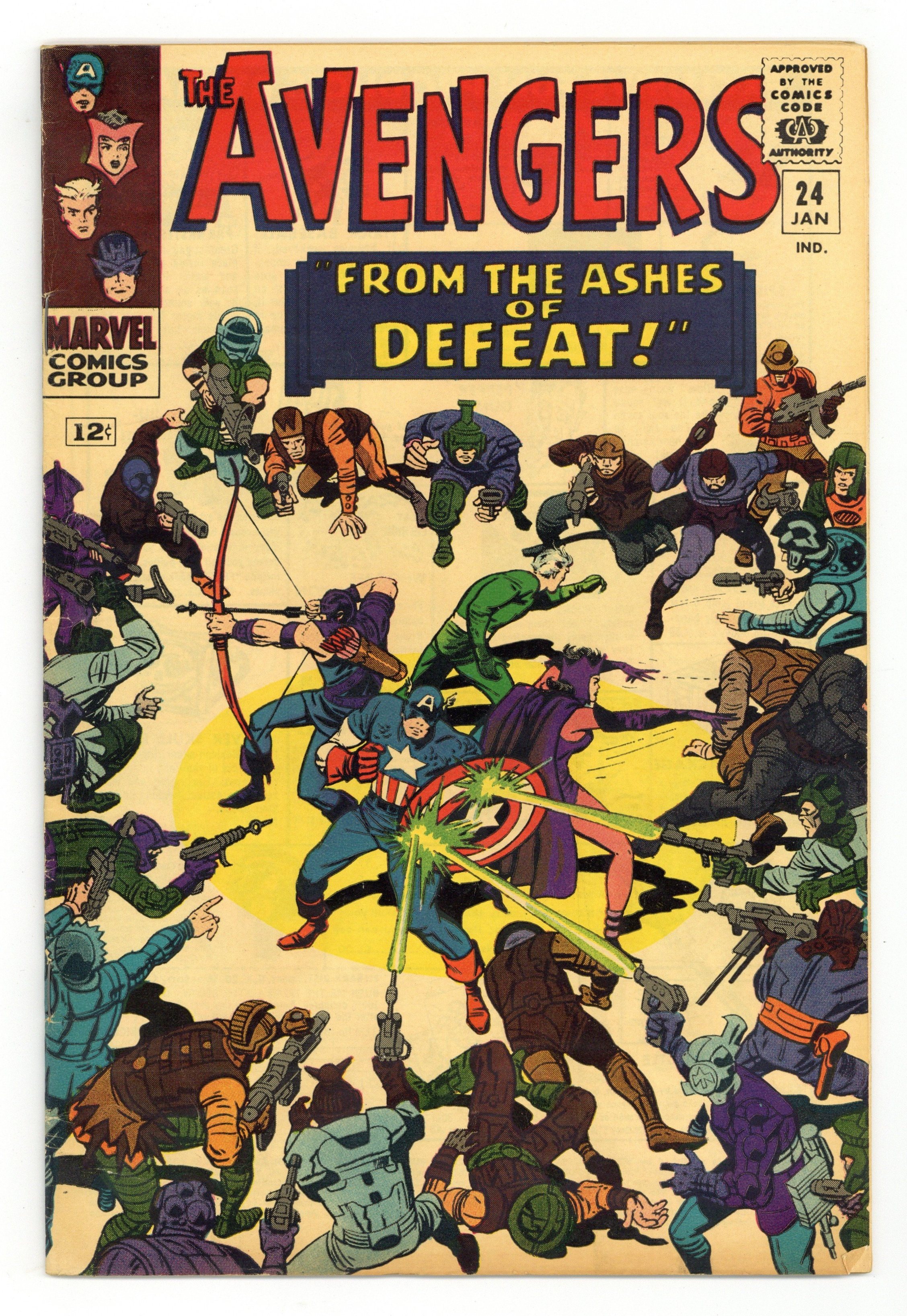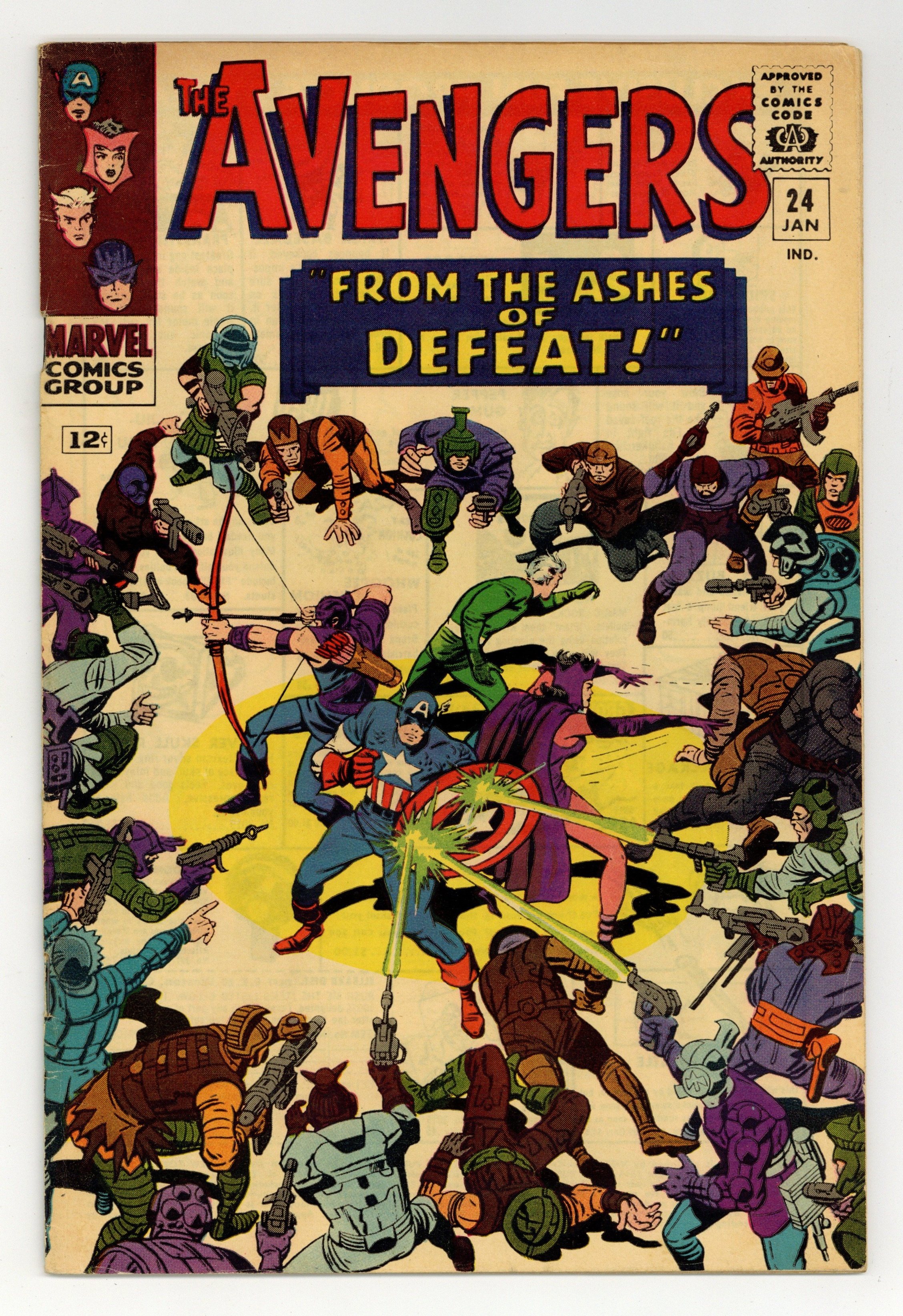 Cover pencils by Jack Kirby, inks by Dick Ayers. "From the Ashes of Defeat - !", script by Stan Lee, pencils by Don Heck, inks by Dick Ayers; Kang's troops advance on the city as Kang escapes; Although hopeless, the Avengers decide to put up a fight against the never-ending army; Quicksilver is put out of action by a stray blast while trying to help a mother and child; The rest of the Avengers battle on but are eventually overwhelmed and captured; Although Kang's law states that monarchs conquered are to be executed, Kang wants to marry Ravonna; Meanwhile, Quicksilver is nursed back to health by the mother he saved; The rest of the generals led by Baltag rebel against Kang and try to assassinate him; Kang is then forced to team up with Captain America, Hawkeye and the Scarlet Witch to save Ravonna and liberate her civilization. Avengers Roll Call: Captain America, Hawkeye, Quicksilver, and the Scarlet Witch. Guest appearance by Princess Ravonna and Carelius. Reprinted in Marvel Triple Action #18. 36 pgs., full color. $0.12. Cover price $0.12.