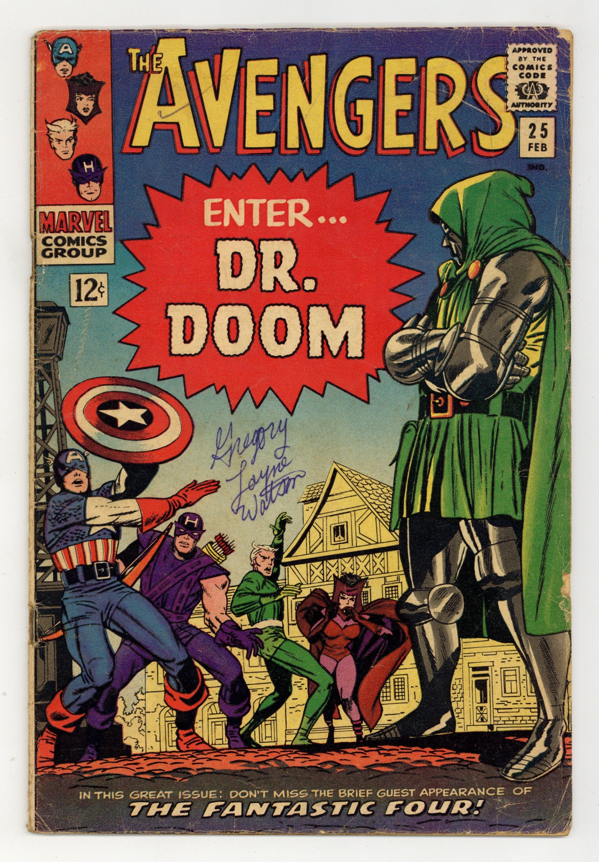 Ends Jan 26 7:30 PM CST Bid History 17 bids Current Bid $101 Your Secret Max Bid If you'd like to bid, please log in or register. Cover pencils by Jack Kirby, inks by Dick Ayers. "Enter... Dr. Doom!", script by Stan Lee, pencils by Don Heck, inks by Dick Ayers; Scarlet Witch and Quicksilver recieve a letter from their Aunt in Latveria and decide to visit her; When they arrive they are jailed and discover it is a trap set up by Doctor Doom, who decides defeating the Avengers will instill fear in to the Fantastic Four,making them easy to defeat; The Fantastic Four attempt to assist the Avengers, but are not allowed, as interference could spark an international incident; Nevertheless, the Avengers escape and fight Doom to a standstill, where he causes a diversion and escapes. Avengers roll call: Captain America, Hawkeye, Quicksilver, and the Scarlet Witch. Guest appearance by the Fantastic Four. Letter to the editor from writer Steve Utley. Reprinted in Marvel Triple Action #19. 36 pgs., full color. $0.12. Cover price $0.12.