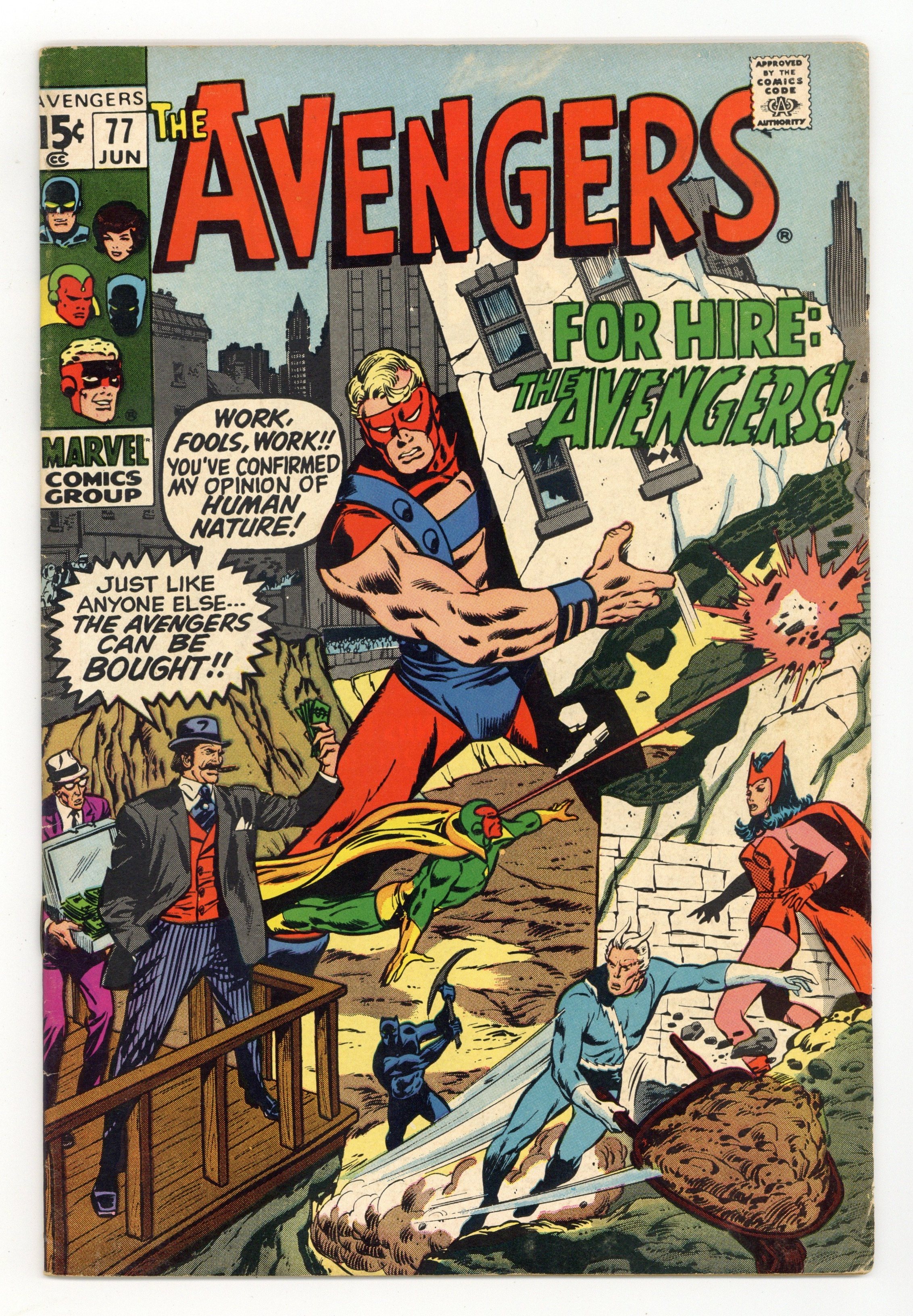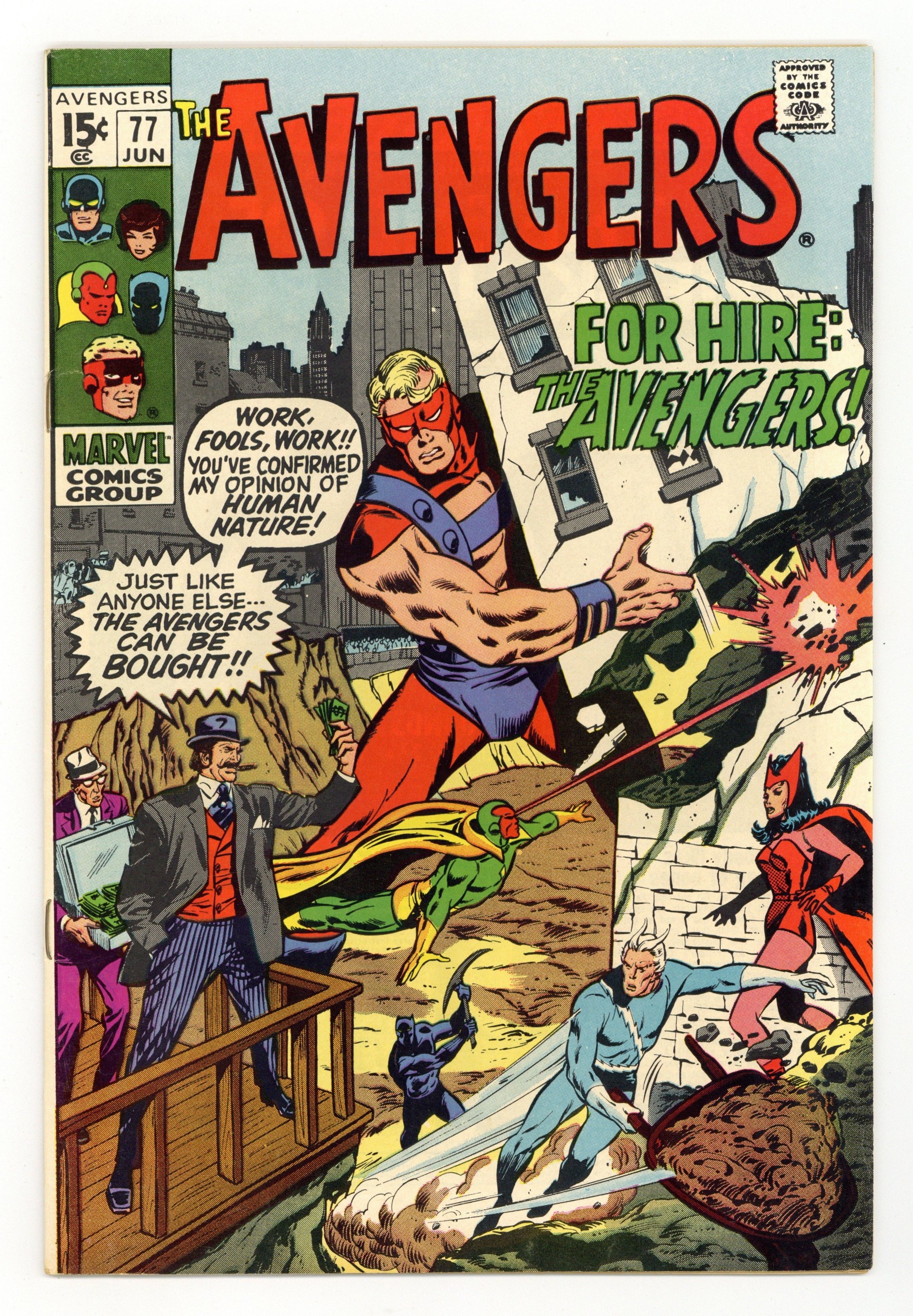 "Heroes for Hire!" Script by Roy Thomas. Pencils by John Buscema. Inks by Tom Palmer. Cover by John Buscema and Tom Palmer. Earth's Mightiest Heroes go to work! And unfortunately for the highest bidder Cornelius Van Lunt! Due to Stark Industries' financial woes caused by a hostile takeover attempt (by the aforementioned Mr. Van Lunt), the Avengers must come up with the back rent long overdue on their Fifth Avenue Mansion! So now it's time to punch the clock! But after completing their first paid assignment; Pietro and T'Challa sense that something isn't quite right about their working arrangement with Mr. Van Lunt! Are Earth's Mightiest Heroes going to walk off the job? Not until they put the Split-Second Squad out of business! First appearance of the Split-Second Squad. Cameo appearance by Johnny Carson. Flashback cameo by Tony Stark. Avengers Lineup: Black Panther, Goliath, Quicksilver, Scarlet Witch, and the Vision. 36 pages. Cover price $0.15.