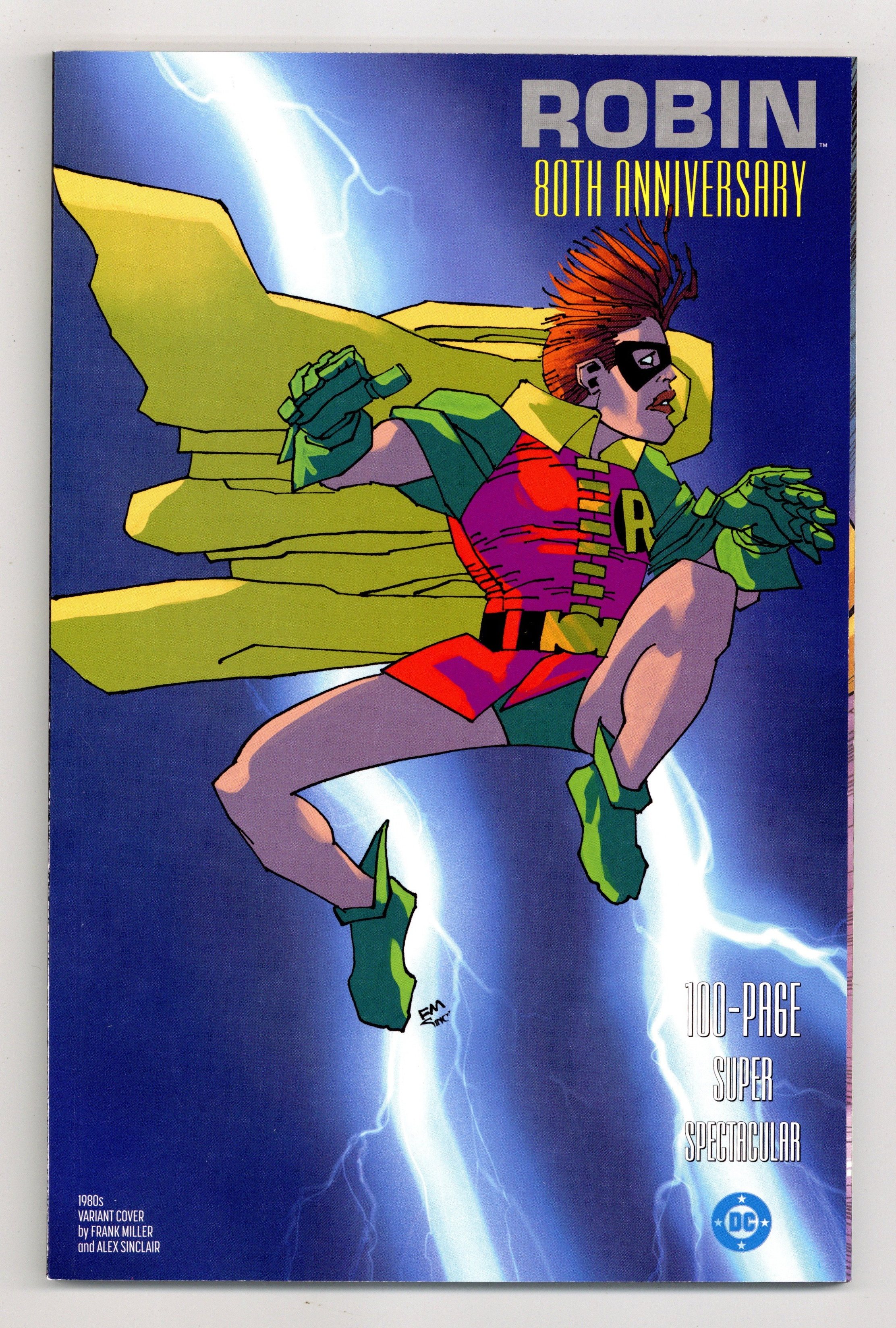$8.50Cover by Frank Miller. Written by Marv Wolfman, Chuck Dixon, Devin Grayson, Tim Seeley, Tom King, Judd Winick, Adam Beechen, James Tynion IV, Amy Wolfram, Peter J. Tomasi and Robbie Thompson. Art by Tom Grummett, Scott McDaniel, Dan Jurgens, Mikel Janin, Dustin Nguyen, Freddie E. Williams II, Javier Fernandez, Damion Scott, Jorge Jimenez, Ramon Villalobos, Scott Hanna, Rob Hunter and Norm Rapmund. DC Comics celebrates Robin the Boy Wonder's 80th anniversary in style with an all-star creative team representing each iteration of the iconic character across eight decades of history! From the high-flying adventures of Dick Grayson to the tragedy of Jason Todd, the enthusiasm of Tim Drake and the arrogance of Damian Wayne, the persistence of Stephanie Brown and the rebelliousness of Carrie Kelley -- the mantle of Robin has been worn by many, but always represents one thing: a hero. Featuring: Dick Grayson, Robin in "A Little Nudge" by Marv Wolfman, Tom Grummett and Scott Hanna; Dick Grayson, Nightwing in "Aftershocks" by Chuck Dixon, Scott McDaniel and Rob Hunter; Nightwing and the Titans in "Team Building" by Devin Grayson, Dan Jurgens and Norm Rapmund; Dick Grayson, Agent 37 in "The Lesson Plan" by Tim Seeley, Tom King and Mikel Janin; Jason Todd, the Red Hood in "More Time" by Judd Winick and Dustin Nguyen; Tim Drake, Robin III in "Extra Credit" by Adam Beechen and Freddie E. Williams II; Tim Drake, Red Robin in "Boy Wonders" by James Tynion IV and Javier Fernandez; Stephanie Brown, Robin IV in "Fitting In" by Amy Wolfram and Damion Scott; the Super Sons in "My Best Friend" by Peter J. Tomasi and Jorge Jimenez; and Damian Wayne, Robin: Son of Batman in "Bat and Mouse" by Robbie Thompson and Ramon Villalobos. Plus: Red Hood and the Outlaws pin-up by Kenneth Rocafort; Stephanie Brown pin-up by Nicola Scott; Robins pin-up by Andy Kubert; and Carrie Kelley pin-up by Frank Miller. Cover price $9.99.