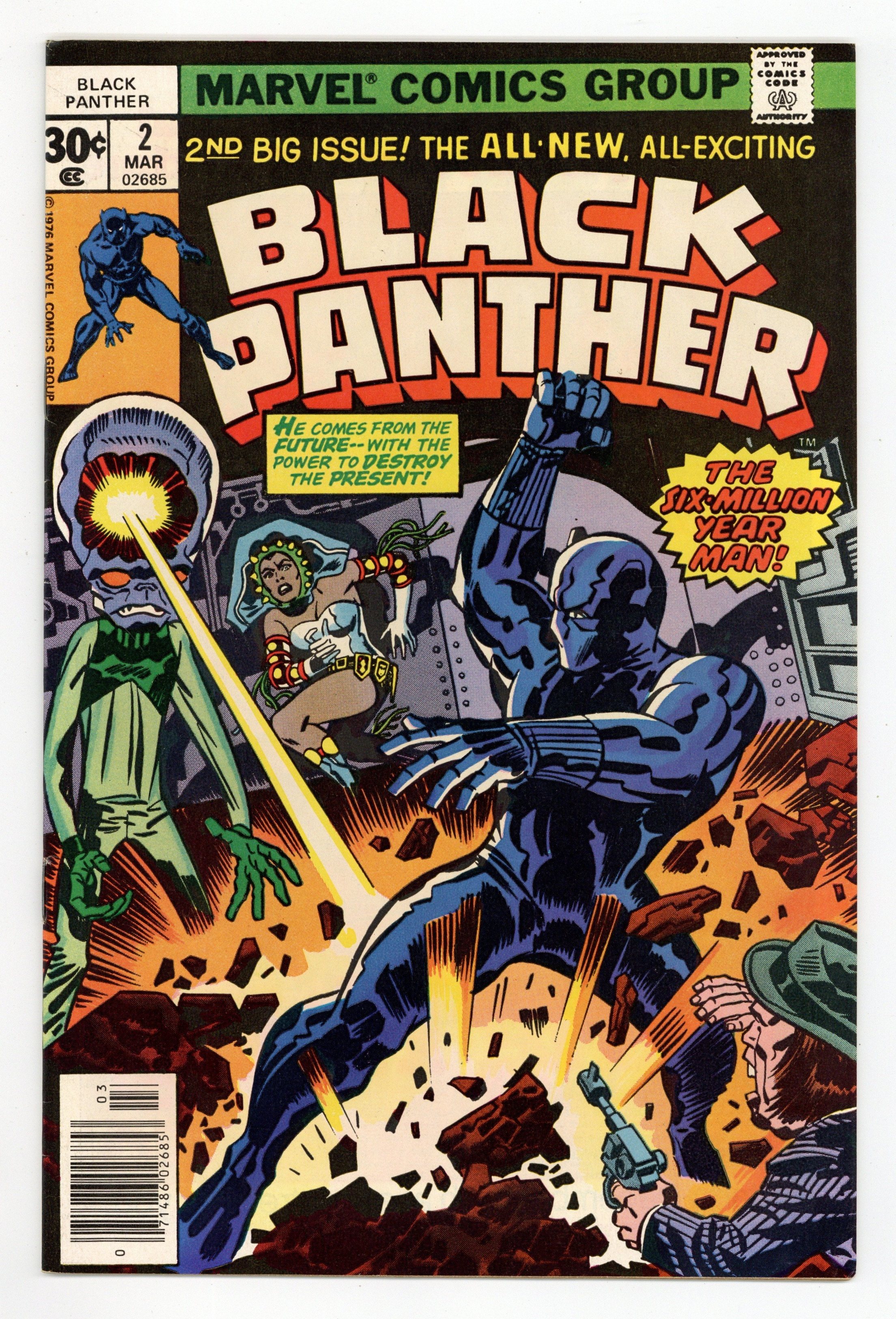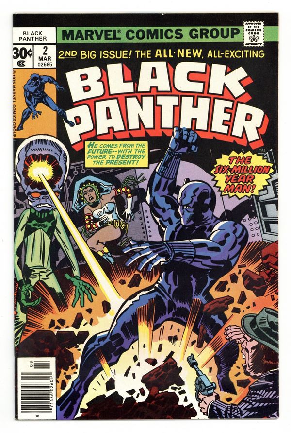 Tags: Marvel Legacy Numbering: Black Panther (part 2), Black Panther$15.00Cover pencils by Jack Kirby, inks by Frank Giacoia. The Six-Million Year Man, script and pencils by Jack Kirby, inks by Mike Royer; Hatch-22 demands to be returned to his own time in the future and mentally attacks Princess Zanda's men; The Black Panther is able to knock out Hatch-22; Princess Zanda joins with the Panther and Abner Little to travel to King Solomon's tomb to retrieve the other Brass Frog in order to complete the time machine and send Hatch-22 back to his own time. Letters responding to an earlier No-prize contest asking readers to guess which book Jack Kirby would write, draw and edit. 36 pgs. $0.30. Cover price $0.30.
