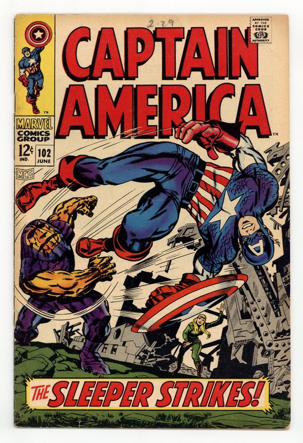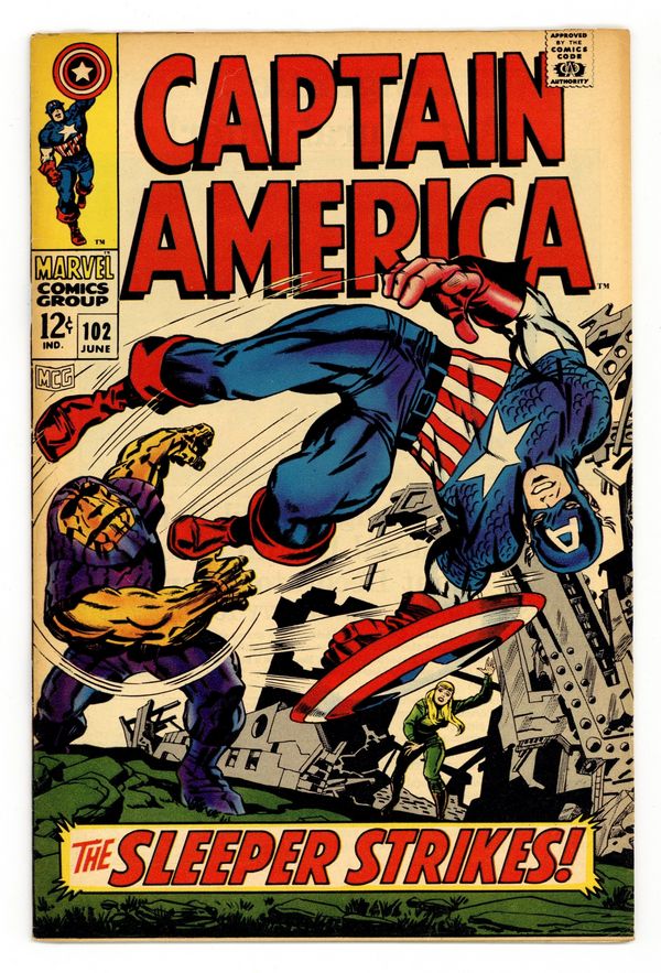 Cover pencils by Jack Kirby, inks by Syd Shores. "The Sleeper Strikes!", script by Stan Lee, pencils by Jack Kirby, inks by Syd Shores; The Red Skull has awakened a fourth Sleeper robot , which is destroying strategic U.S. locations with its power blasts; Cap and Agent 13 try to track the Sleeper on its path of destruction; The Red Skull sends his henchman to try and prevent the heroes from destroying the robot; Cap battles the robot. Brief Nick Fury appearance. Marvel Super-Hero T-Shirts ad. Letter to the editor from comics writer Doug Moench. Ad for Doctor Strange and Nick Fury, Agent of S.H.I.E.L.D. 36 pgs., full color. $0.12. Cover price $0.12.