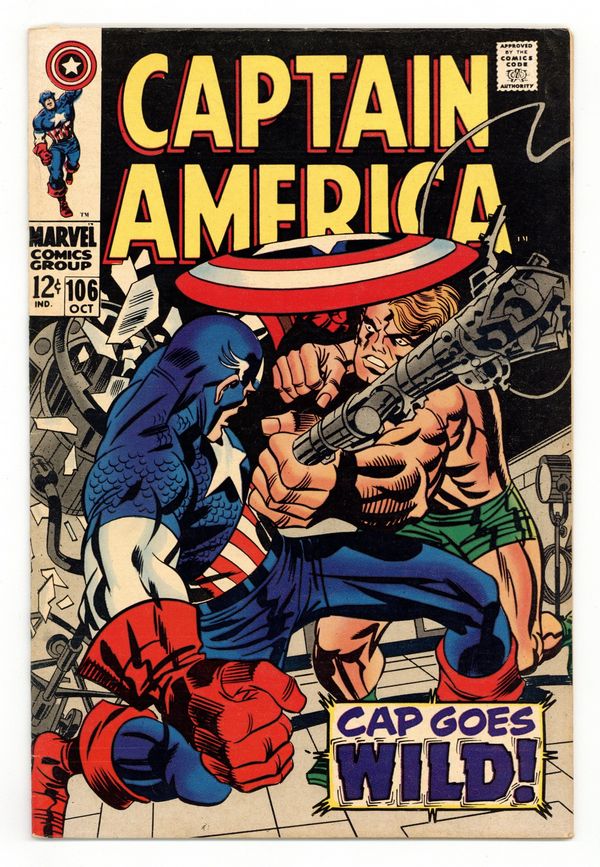 Tags: Marvel Legacy Numbering: Captain America (part 106), Captain America$45.00Cover pencils by Jack Kirby, inks by Frank Giacoia. "Cap Goes Wild!", script by Stan Lee, pencils by Jack Kirby, inks by Frank Giacoia; Costumed Asian spies attack SHIELD headquarters and steal the plans for the latest prototype model of the Life Model Decoy for what they call Operation: Replica, which Chairman Mao oversees; Captain America tries to stop them; Infinity Productions film company is working on a Captain America movie. Letter to the editor from writer Dwight Decker. 36 pgs., full color. $0.12. Cover price $0.12.