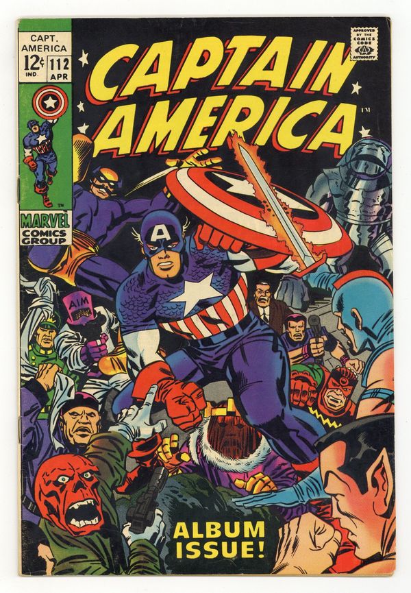 Tags: Marvel Legacy Numbering: Captain America (part 112), Captain America$31.00Cover pencils by Jack Kirby, inks by Frank Giacoia. "Lest We Forget!", script by Stan Lee, pencils by Jack Kirby (Jack did the art for this issue in a single 24 hour marathon!), inks by George Tuska; After Hydra attacks at a carnival, Captain Americas uniform, riddled with bullets, convinces everyone that Cap is dead; At Avengers Mansion, Iron Man prepares a statement saying Cap is dead; Reminiscing on Captain America's heroic feats during World War II, Iron Man recalls how Cap and Bucky battles the Red Skull, including a story in which Cap and Bucky ruined the Red Skulls plot to use a giant power drill; He also recalls Cap clashes with such villains as the Butterfly, the original Circus of Crime, the Unholy Legion of Beggars, White Death, the Toadman, and Baron Zemo; Cameo by Red Skull imposter George Maxon; Tony Stark (Iron Man) narrates this story. 36 pgs., full color. $0.12. Cover price $0.12.