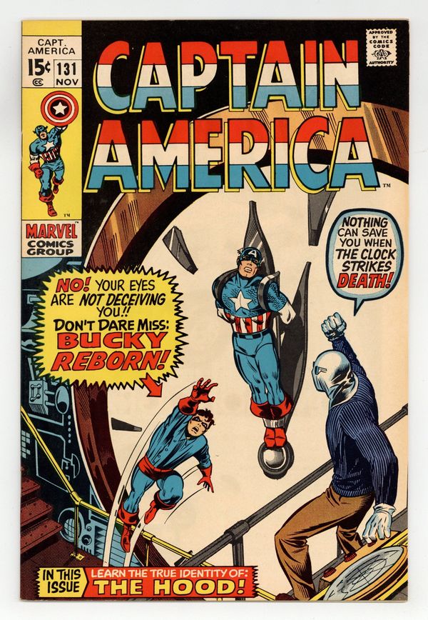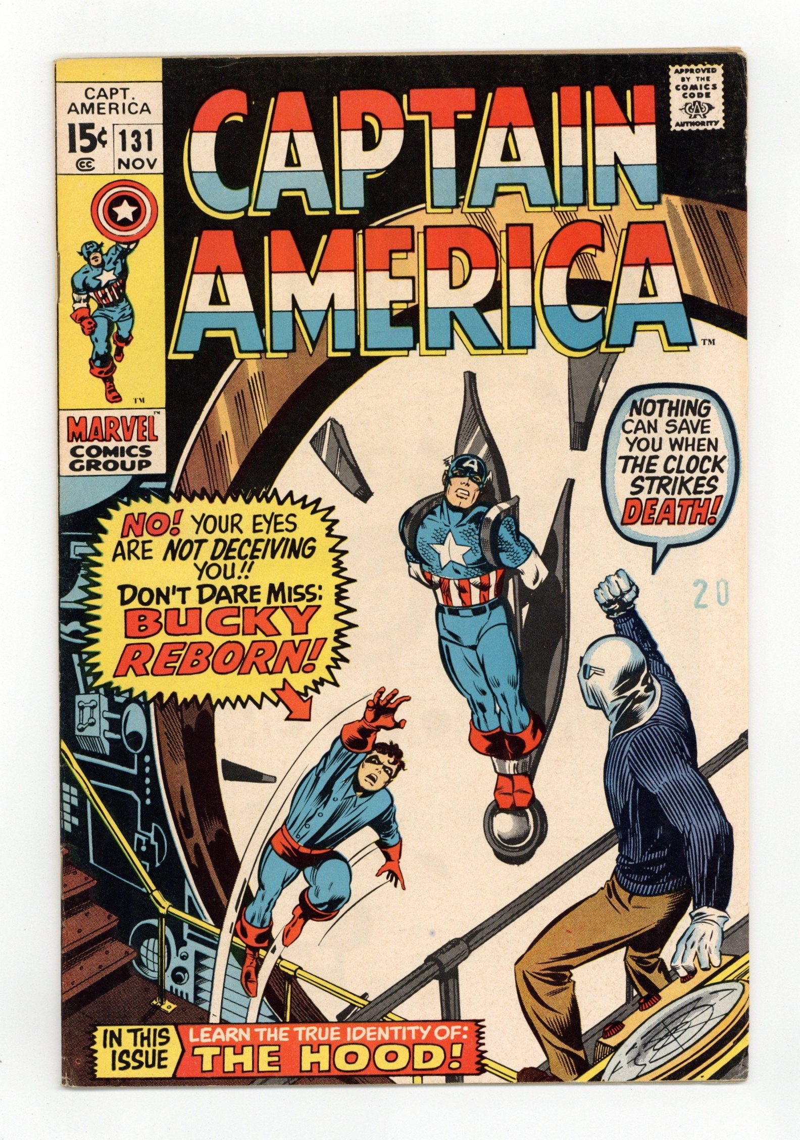 Tags: Marvel Legacy Numbering: Captain America (part 131), Captain America$19.00Cover pencils by Marie Severin, inks by Joe Sinnott. "Bucky Reborn!", script by Stan Lee, pencils by Gene Colan, inks by Dick Ayers; Baron Strucker finds an amnesiac young man in the gyms of San Francisco and hypnotizes him into thinking he is Bucky; Strucker uses "Bucky" to lure Captain America into a trap; Cap and "Bucky" battle and defeat Strucker. Red Skull cameo. 36 pgs., full color. $0.15. Cover price $0.15.