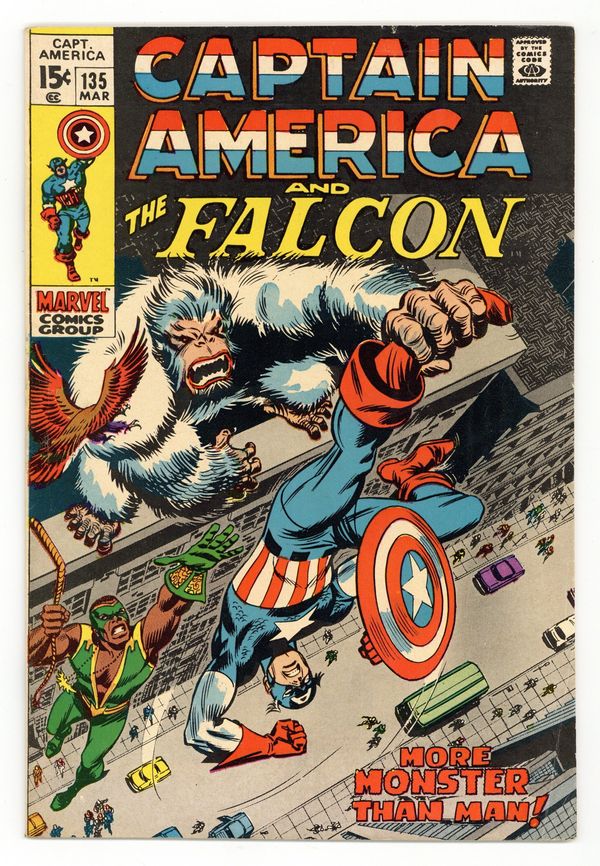 Cover by John Romita. "More Monster Than Man!", script by Stan Lee, pencils by Gene Colan, inks by Tom Palmer (Palmer is generally acknowledged as Colan's best inker, but this is his only work with Colan on Cap); Captain America takes Falcon to SHIELD headquarters to meet Nick Fury; Falcon battles Dum-Dum Dugan in the gym; Cap tries to talk to Sharon, but she brushes him off, citing the new Project Earth-Dig; Cap and the Falcon battle Dr. Erik Gorbo, a SHIELD scientist who has gone on a crime spree after turning himself into a monster ape. Missive from letter hack Guy Lilliam III. 36 pgs., full color. $0.15. Cover price $0.15.