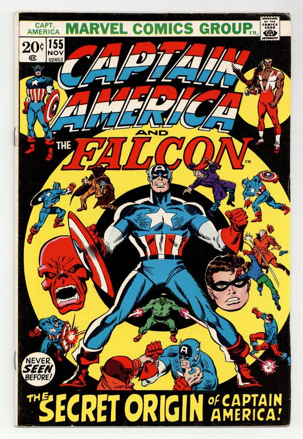 "The Incredible Origin of the Other Captain America!" Part 3 of 4. Script by Steve Englehart. Pencils by Sal Buscema. Inks by Frank McLaughlin. Cover by Sal Buscema and Jim Mooney. Steve Rogers and Sharon Carter are enjoying their vacation in the Bahamas...when they are suddenly ambushed on the beach by Captain America (aka William Burnside) and Bucky (aka Jack Monroe)! Steve and Sharon don't know what is happening, but they realize they're in grave danger! Luckily, the Falcon and Redwing arrive on the sand and join the battle! But Cap and Bucky have super-strength, and they win. Then the 1950s Captain America spins the astonishing tale of how he came to be. Origins of William Burnside and Jack Monroe. (Note: This issue includes 3 pages of excerpts from Young Men #24 (published in 1953) with script by Don Rico and art by John Romita Sr.) 36 pages. Cover price $0.20.