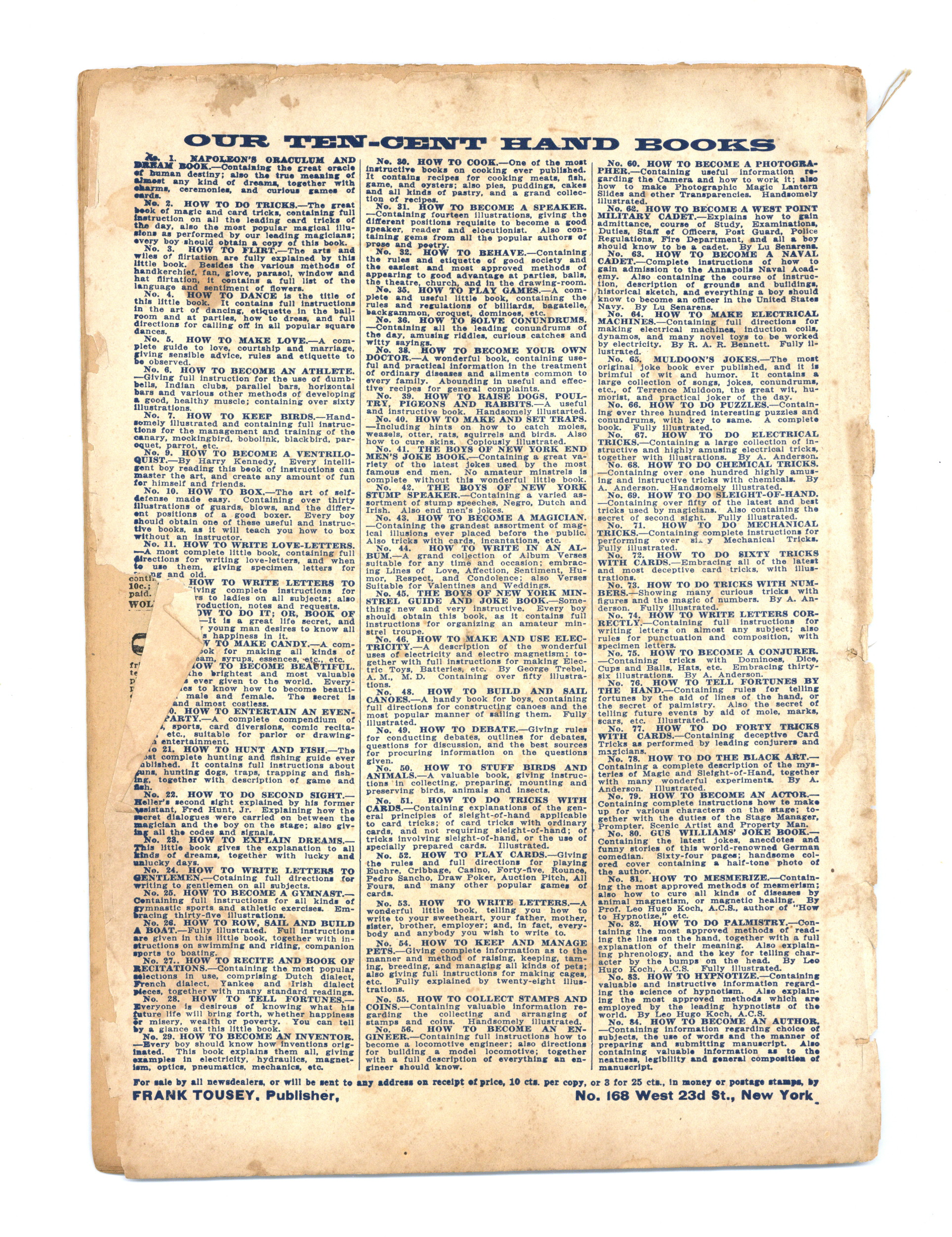 Published Nov 1912 by Frank Tousey.$5.00- Cover Detached. Water damage: Slight. Staple rust: Slight.