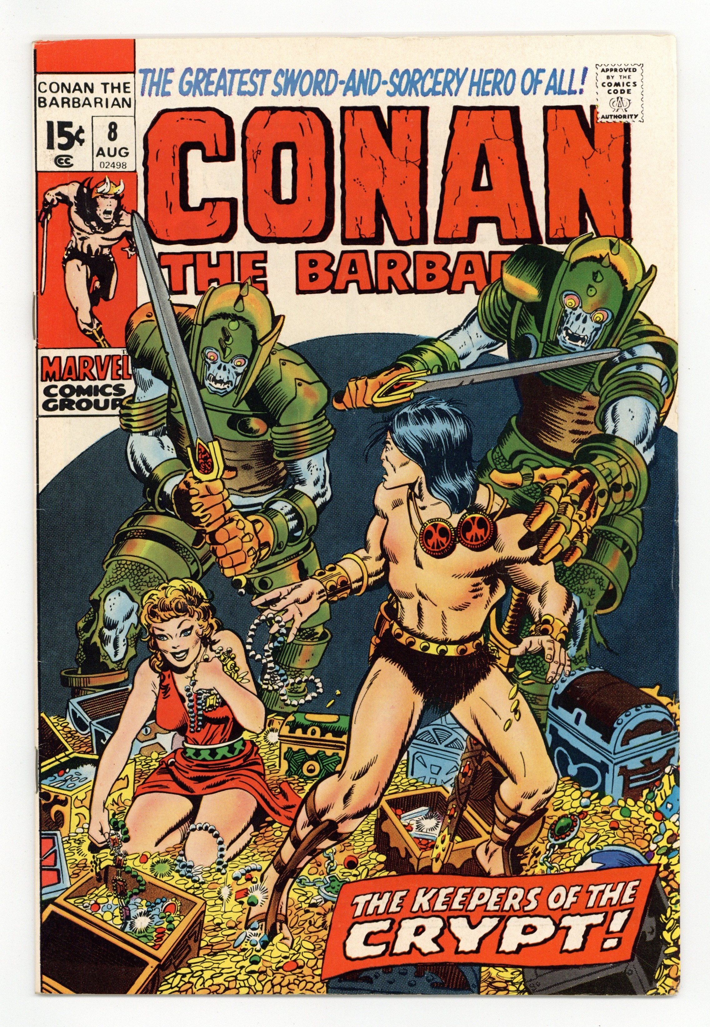Cover art by Barry Windsor-Smith and John Romita (re-touches). The Keepers of the Crypt, script by Roy Thomas, pencils by Barry Windsor-Smith, inks by Tom Sutton and Tom Palmer; setting: Lost city of Lanjau; Conan battles a giant lizard & Undead creatures; Jenna & Conan flee village on horse at end of story; adapted from a synopsis by Robert E. Howard. The letters page reprints the Hyborian Age map from Conan 1. 36 pgs. Cover price: $0.15. Cover price $0.15.