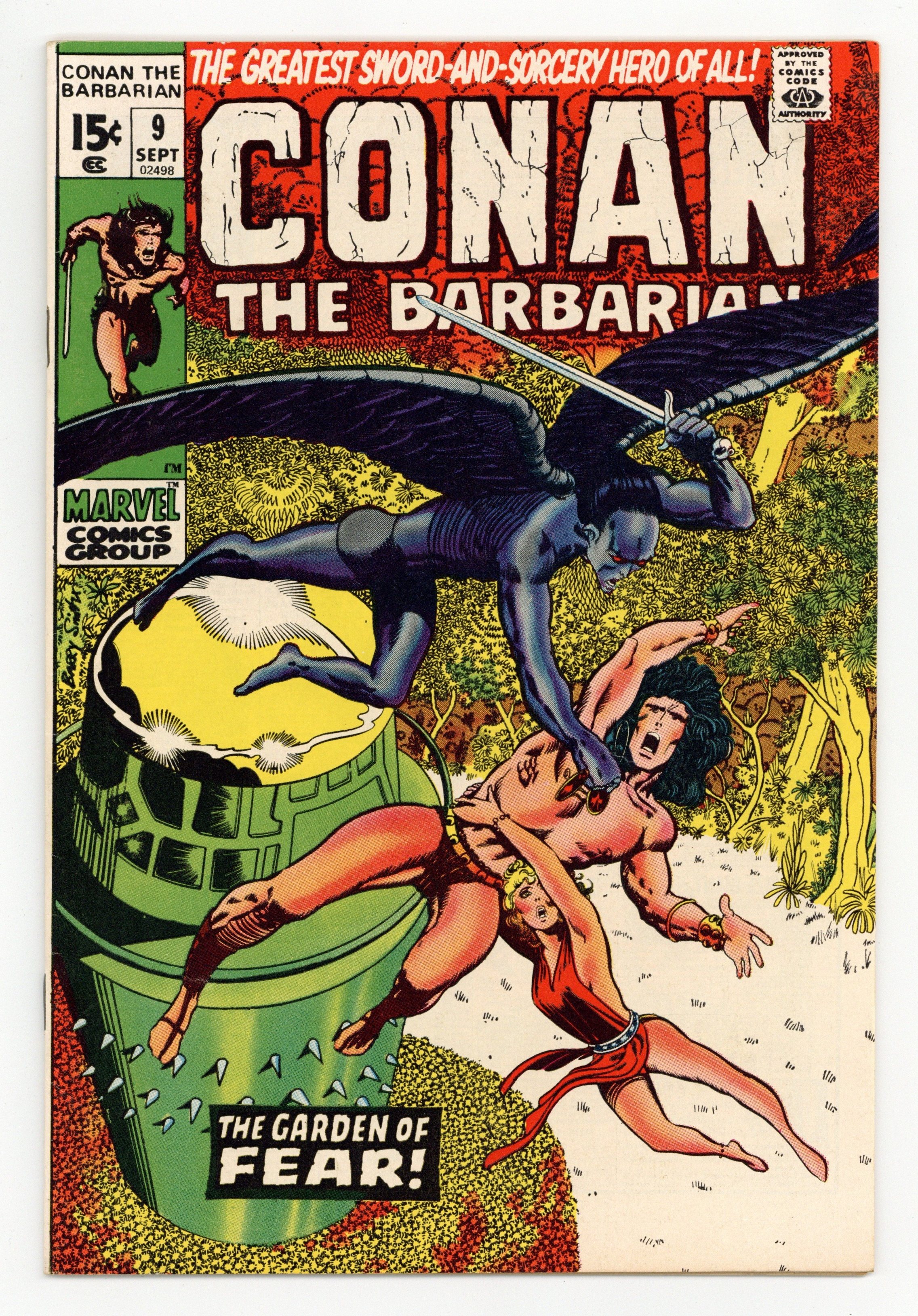 Last 15-cent issue. Cover art by Barry Windsor-Smith. Last 15-cent issue. The Garden of Fear, script by Roy Thomas, pencils by Barry Windsor-Smith, inks by Sal Buscema; setting: primitive village & lost valley with Wooly Mammoths & man-eating flowers; Conan saves Jenna & kills sole survivor of ancient winged race; adapted from the non-Conan story by Robert E. Howard. 36 pgs. Cover price: $0.15. Cover price $0.15.