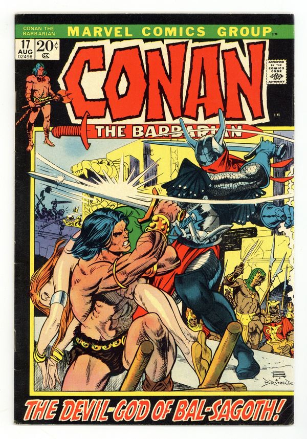 Tags: Marvel Legacy Numbering: Conan (part 17), Conan$13.50Cover art by Gil Kane and Frank Brunner. The Gods of Bal-Sagoth, script by Roy Thomas, pencils by Gil Kane, inks by Ralph Reese; setting: Ship in the Vilayet Sea, Island city of Bal-Sagoth; Conan saves Kyrie and restores her as queen of Bal-Sagoth.Adapted from the non-Conan (Turlogh O'Brien) story by Robert E. Howard; Fafnir appearance. Letter to the editor from comic writer Marc DeMatteis. The letters page also contains the nominations for the 1971 Shazam awards (the Academy of Comic Book Arts, or the ACBA). Kane cover pencils, Frank Brunner cover inks. 36 pgs. Cover price $0.20. Cover price $0.20.