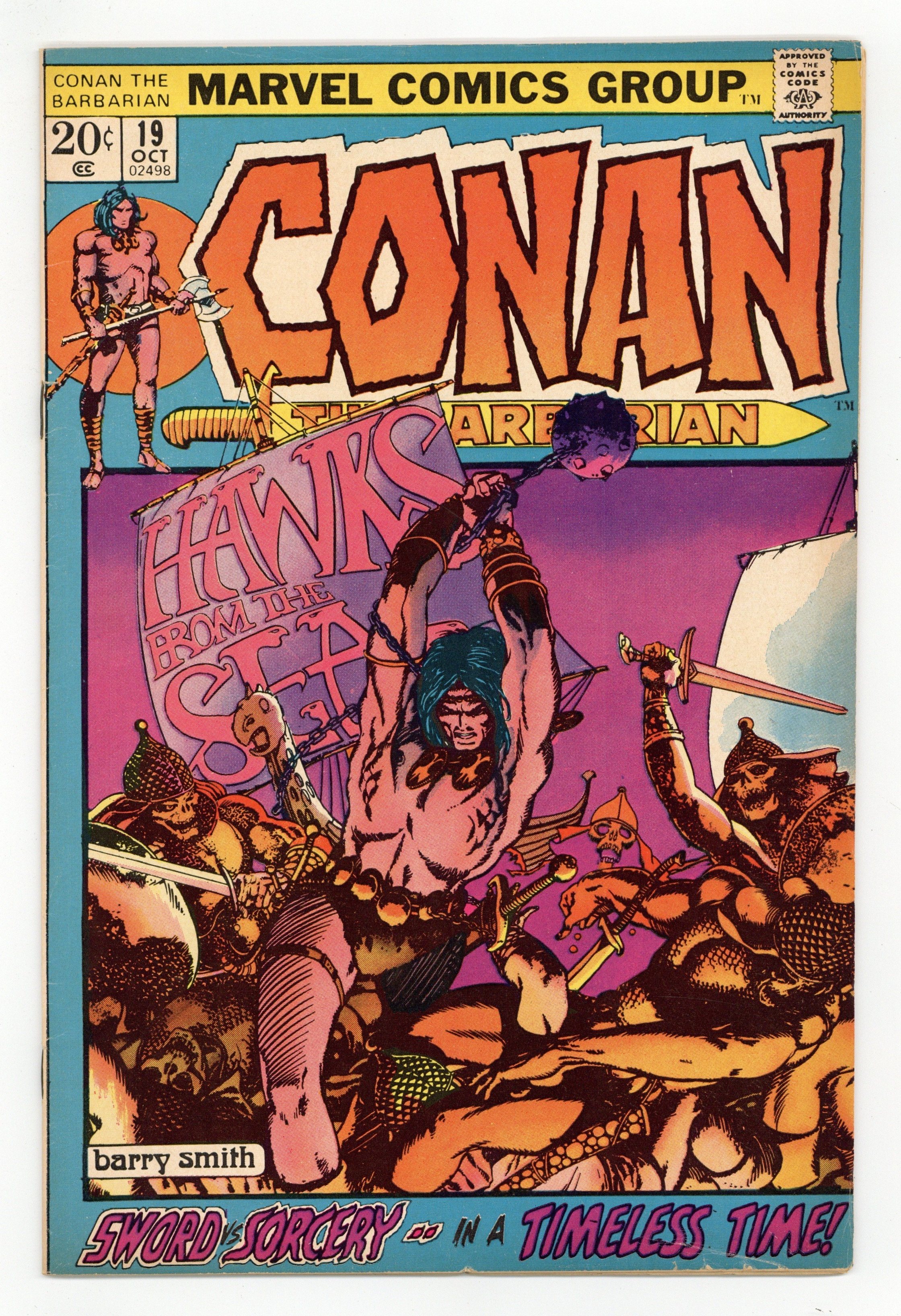 Cover art by Barry Windsor-Smith. Hawks From the Sea, script by Roy Thomas, pencils by Barry Windsor-Smith, inks (pages 1-9) by Dan Adkins. (Pages 10-20 were reproduced directly from the pencils); setting: Ship, City of Makkalet; Conan works for Turanian military and lays seige to Makkalet; Legend of the Living Tarim is told; Conan makes enemy of Balthaz; Fafnir is wounded by flaming arrow. 36 pgs. Cover price $0.20. Cover price $0.20.