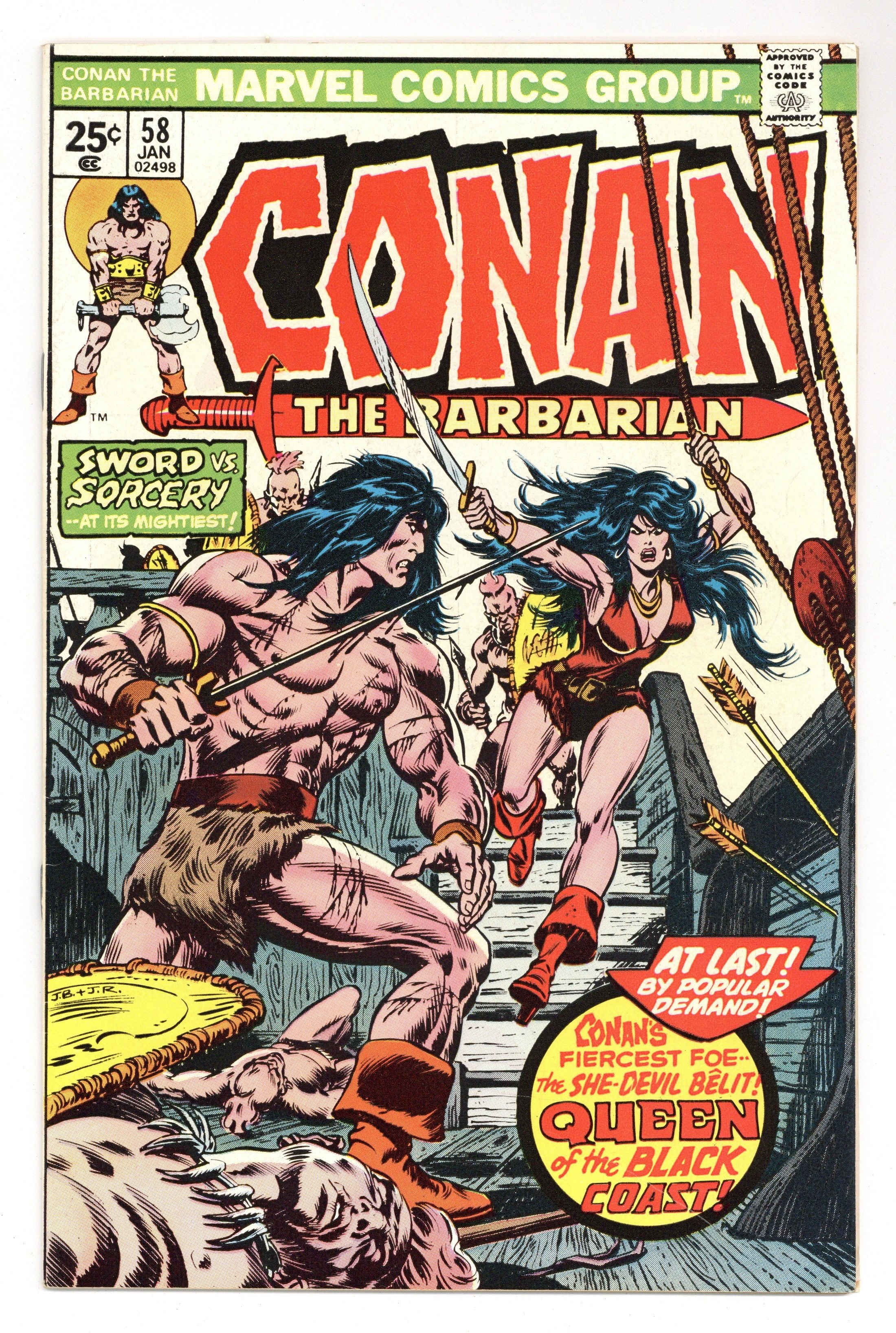 Tags: Marvel Legacy Numbering: Conan (part 58), Conan$32.00Cover pencils by John Buscema, inks by John Romita. First full appearance of Belit (she appearaed in a flashback cameo in Giant-Size Conan 1) in Queen of the Black Coast, script by Roy Thomas, pencils by John Buscema, inks by Steve Gan; setting: Tigress; First appearance of Belit; Odongo kills Tito; Conan becomes Belit's lover; adapted from the story "Queen of the Black Coast" by Robert E. Howard. Spider-Man stars in a one-page Hostess ad, The Kidnap Caper. 36 pgs. Cover price $0.25. Cover price $0.25.