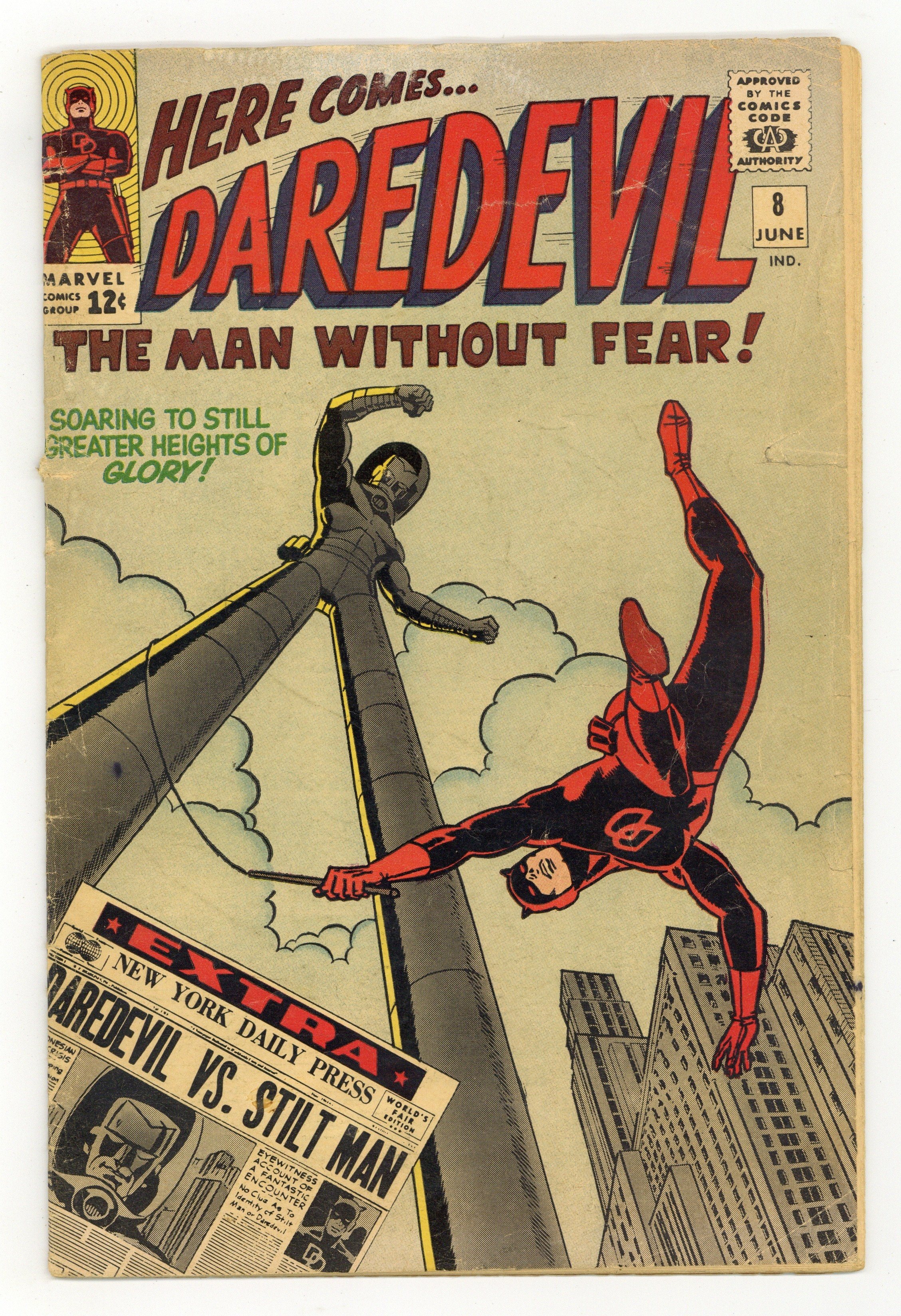 Starts Apr 4 Cover art by Wally Wood. First appearance of the Stilt-Man in The Stilt-Man Cometh!, script by Stan Lee, art and cover by Wally Wood; Nelson and Murdock are hired by a disgruntled scientist who claims his boss stole his invention; The scientist turns out, not only to be the real thief, but also the new villain, Stilt-Man. House ad for Fantastic Four #40 and Amazing Spider-Man #26. Letter by artist Alan Hutchinson. 36 pgs. Cover price $0.12. Cover price $0.12.