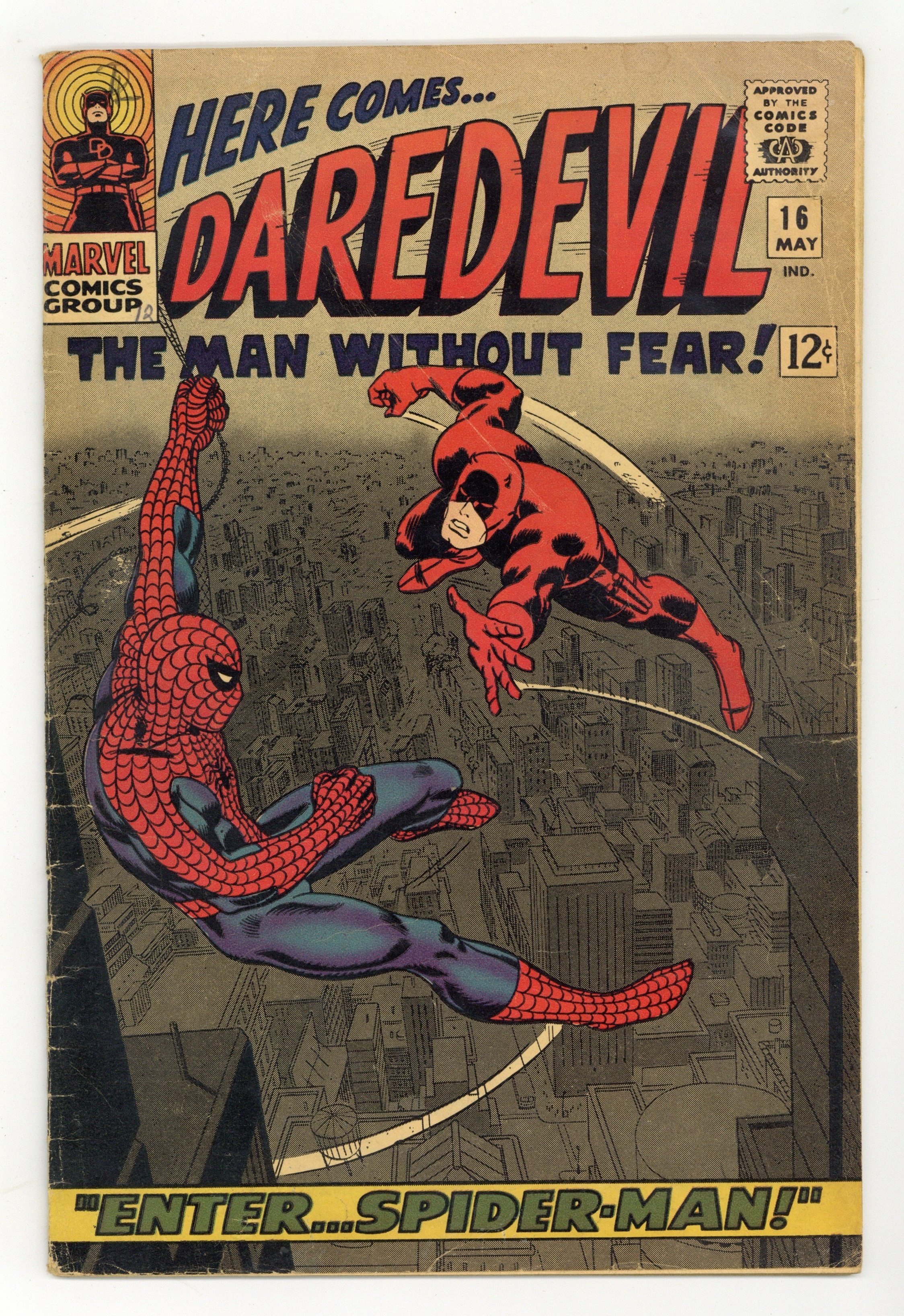 Starts Apr 4 Cover pencils by John Romita, inks by Frank Giacoia. Spider-Man guest stars in Enter Spider-Man!, script by Stan Lee, pencils by John Romita Sr., inks by Frank Giacoia (as "Frank Ray"); The Masked Marauder comes up with a plan to pit Spidey and DD against each other while he makes off with an experimental engine; First appearance of the Masked Marauder. Letter to the editor from comics retailer Bud Plant. 36 pgs. 36 pgs. Cover price $0.12. Cover price $0.12.