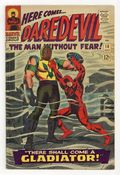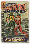 Cover pencils by John Romita, inks by Frank Giacoia. First appearance of the Gladiator in There Shall Come a Gladiator!, plot by Stan Lee, script by Lee (pages 1-7) and Dennis O'Neil (pages 8-20), pencils by John Romita Sr., inks by Frank Giacoia; A burly costume store owner decides it is really the clothes that make the man and begins his career as the Gladiator; Foggy gets a Daredevil costume from Melvin who talks the tubby lawyer into setting up a staged super fight to impress Karen; Thinking his fight with Foggy will draw out the real DD, Gladiator goes after him for real and Matt has to take a hand in rescuing his friend; In the night and the fog, everyone assumes it is Foggy as Daredevil that beat the Gladiator back; cameos by Thor, Dr. Strange, Captain America, and Dr. Doom (as costumes in the Gladiator's costume shop). 36 pgs. Cover price $0.12. Cover price $0.12.