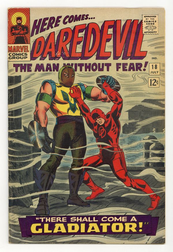 Tags: Marvel Legacy Numbering: Daredevil (part 18), Daredevil$33.00Cover pencils by John Romita, inks by Frank Giacoia. First appearance of the Gladiator in There Shall Come a Gladiator!, plot by Stan Lee, script by Lee (pages 1-7) and Dennis O'Neil (pages 8-20), pencils by John Romita Sr., inks by Frank Giacoia; A burly costume store owner decides it is really the clothes that make the man and begins his career as the Gladiator; Foggy gets a Daredevil costume from Melvin who talks the tubby lawyer into setting up a staged super fight to impress Karen; Thinking his fight with Foggy will draw out the real DD, Gladiator goes after him for real and Matt has to take a hand in rescuing his friend; In the night and the fog, everyone assumes it is Foggy as Daredevil that beat the Gladiator back; cameos by Thor, Dr. Strange, Captain America, and Dr. Doom (as costumes in the Gladiator's costume shop). 36 pgs. Cover price $0.12. Cover price $0.12.