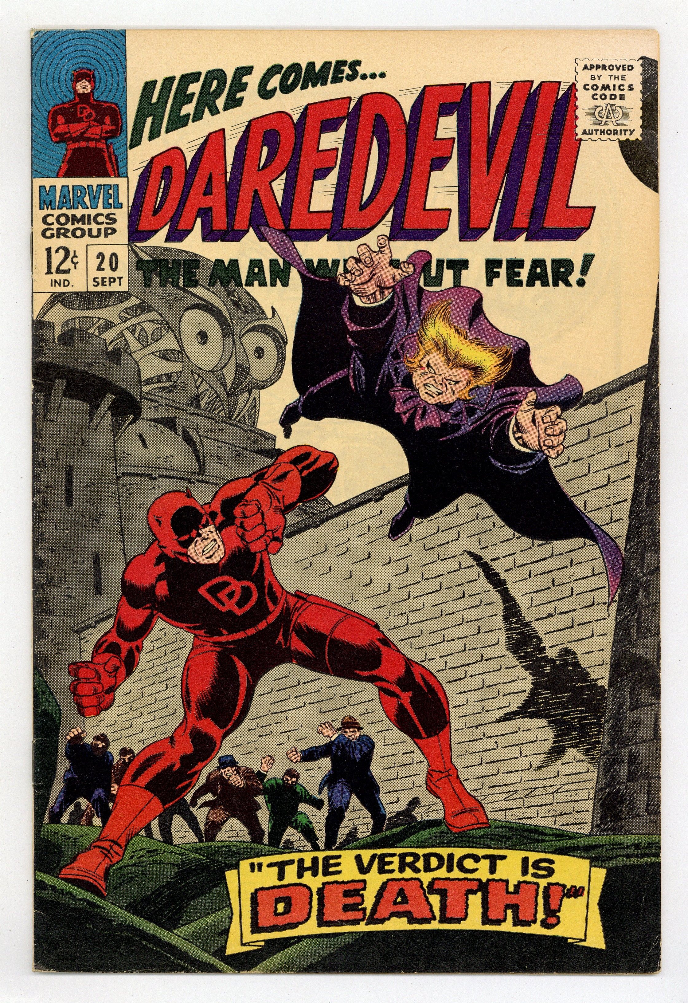 Cover pencils by John Romita, inks by Frank Giacoia. The Owl returns in The Verdict Is: Death!, script by Stan Lee, pencils by Gene Colan (first work on the title), inks by Frank Giacoia; The Owl kidnaps Matt Murdock to be the defense attorney in a mock trial the fowlish fiend has set up for the judge who sent him to prison. Reprinted in Giant-Size Marvel Triple Action #1. 36 pgs. Cover price $0.12. Cover price $0.12.