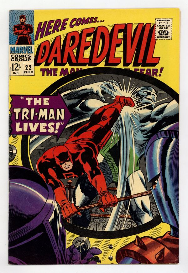 Ends Mar 16 7:48 PM CST Bid History 7 bids Current Bid $38 Your Secret Max Bid If you'd like to bid, please log in or register. Cover pencils by Gene Colan, inks by Frank Giacoia. First appearance of the Tri-Man (the Mangler, the Dancer, and the Brain) in The Tri-Man Lives!, script by Stan Lee, pencils by Gene Colan, inks by Frank Giacoia (pages 1-9) and Dick Ayers (pages 10-20); The Masked Marauder and Gladiator create the Tri-Android and power him up with the combined skills of three master criminals; The dastardly duo send their android after DD in a bid to win leadership of the Maggia; appearance by the Owl. 36 pgs. Cover price $0.12. Cover price $0.12.