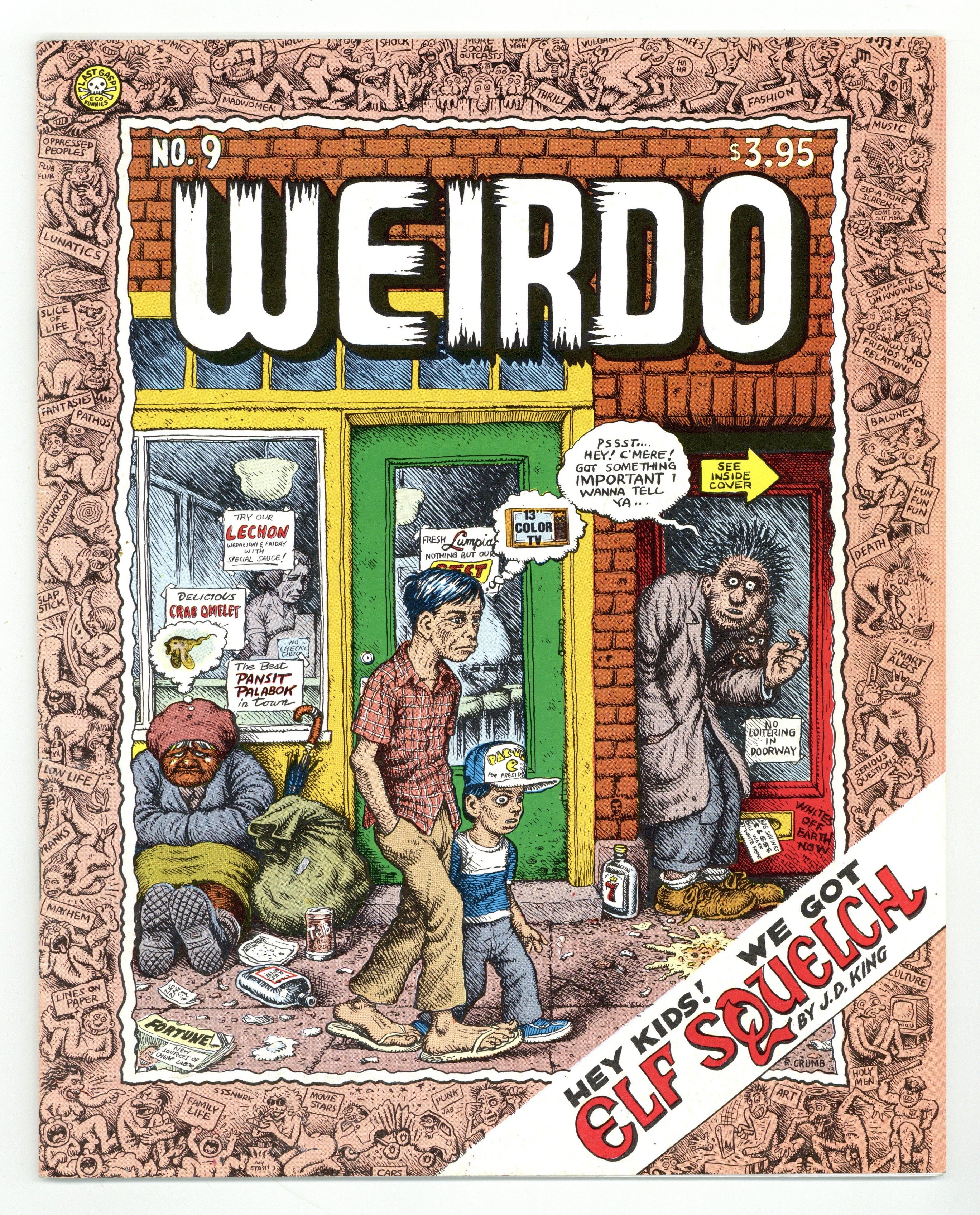 Second Printing. Cover by Robert Crumb. "Elf Squelch," script by Jane King and J.D. King, art by J.D. King; a parody of ElfQuest. "Arline 'n' Bob and That Thing In the Bedroom," script and art by Robert Crumb and Aline Kominsky-Crumb; The trials of having an infant child. "Mission Nites," script and art by Spain Rodriguez; Big Bitch is on Trashman's trail. "Cockroach Crisis," script and art by B.N. Duncan; Hannah ponders the sanctity of life. Six illustrations by Max Crumb. "I Married A Jerk," script and art by Peter Bagge; The faults of a geek husband. "The Artist Meets a Swinger or... Crabs Eating Raoul," script and art by Dori Seda; Dori's experience with swingers. "Cave Nudes," script and art by John Kricfalusi (as Billy Bunting); Flintstones parody. "Modern Boy," script and art by Dave Geary; The modern boy rails against society. 44 pgs., B&W. 8-in. x 11-in. $3.95. Cover price $2.50.