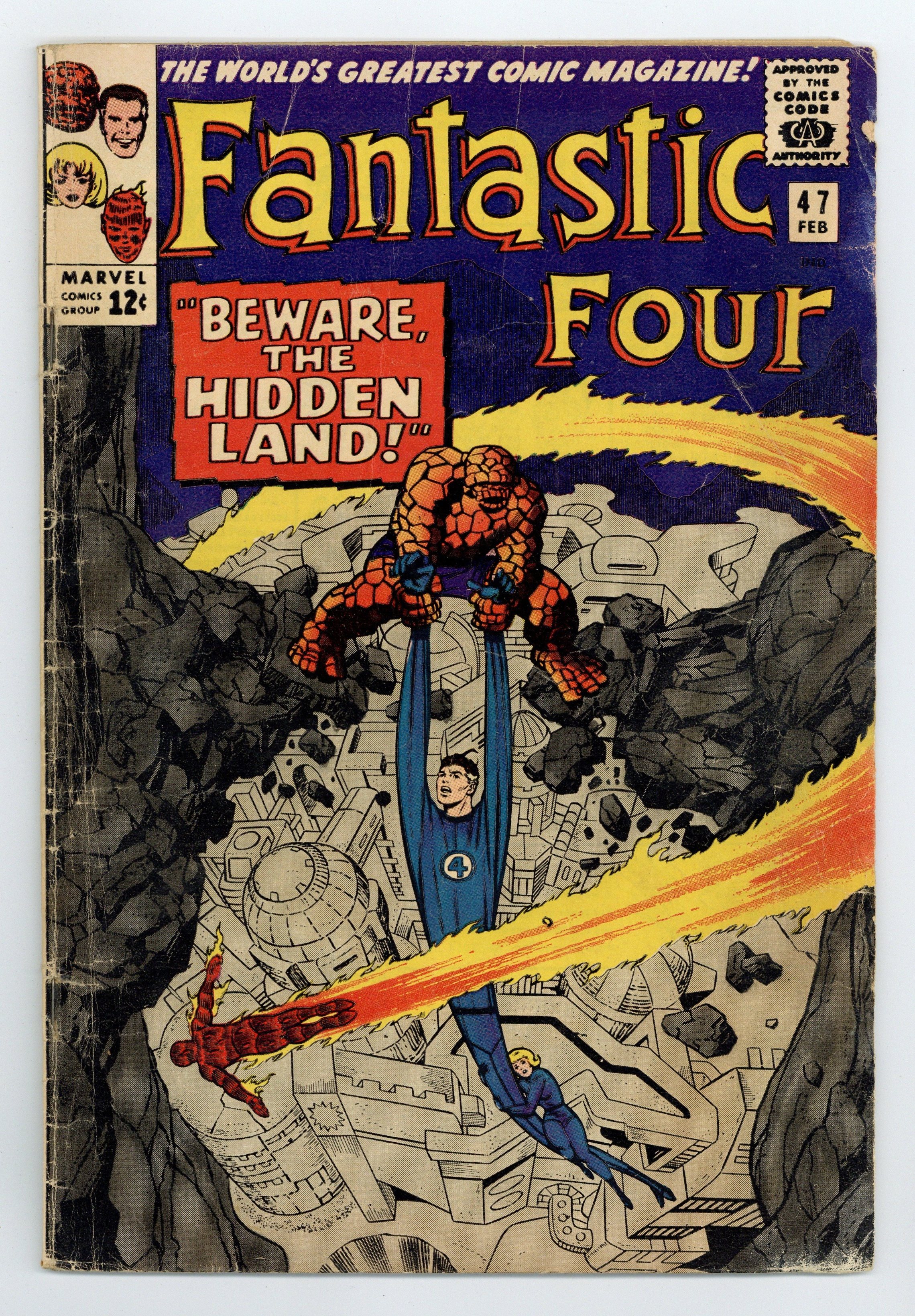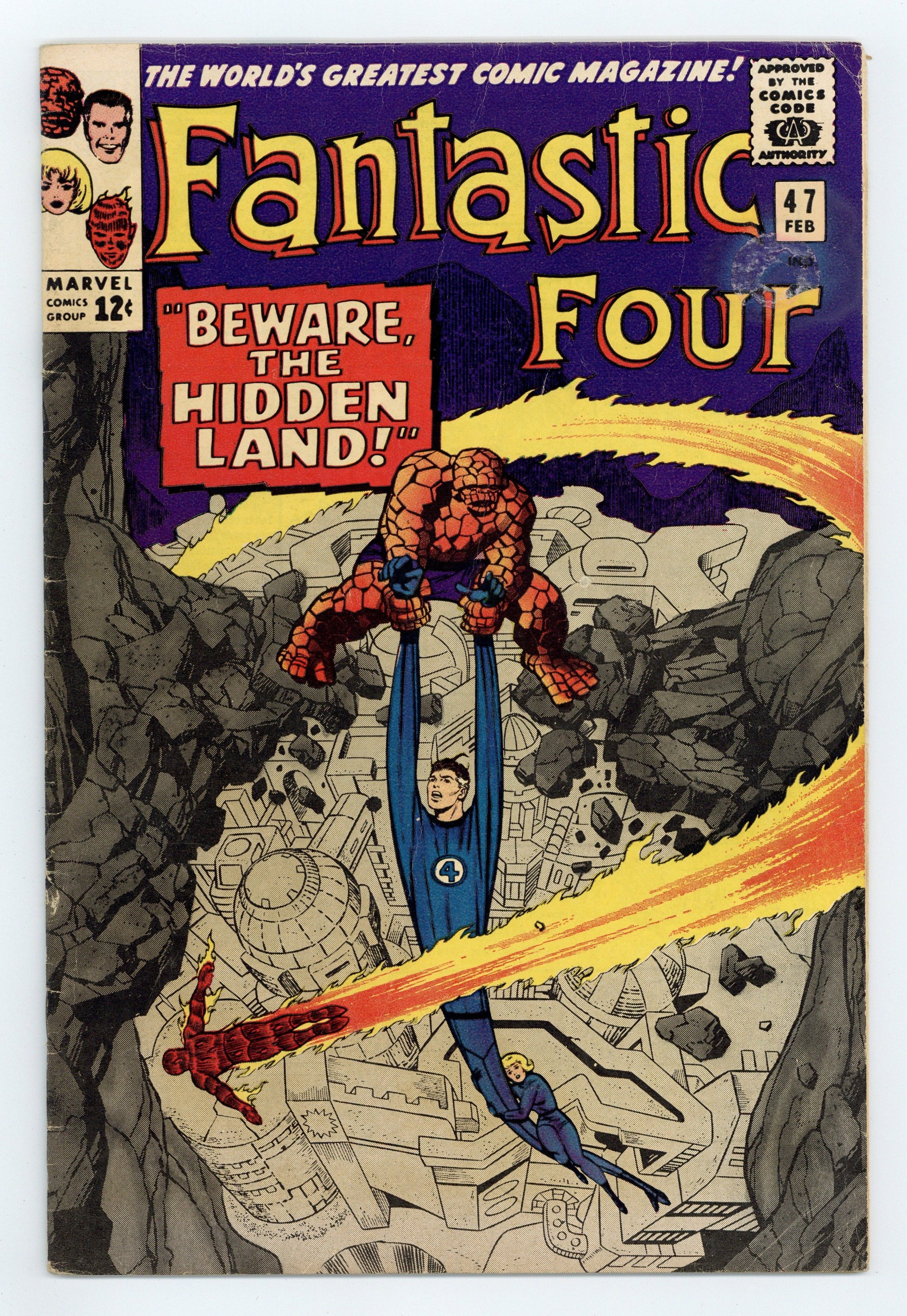 Starts Apr 4 Cover pencils by Jack Kirby, inks by Joe Sinnott. Beware the Hidden Land!, script by Stan Lee, pencils by Jack Kirby, inks by Joe Sinnott; After subduing Dragon Man, the FF follow the Inhumans to their Great Refuge. House ad, with covers shown, for Amazing Spider-Man #33, X-Men #16, and Marvel Collectors' Item Classics #1. 36 pages, full color. Cover price $0.12.
