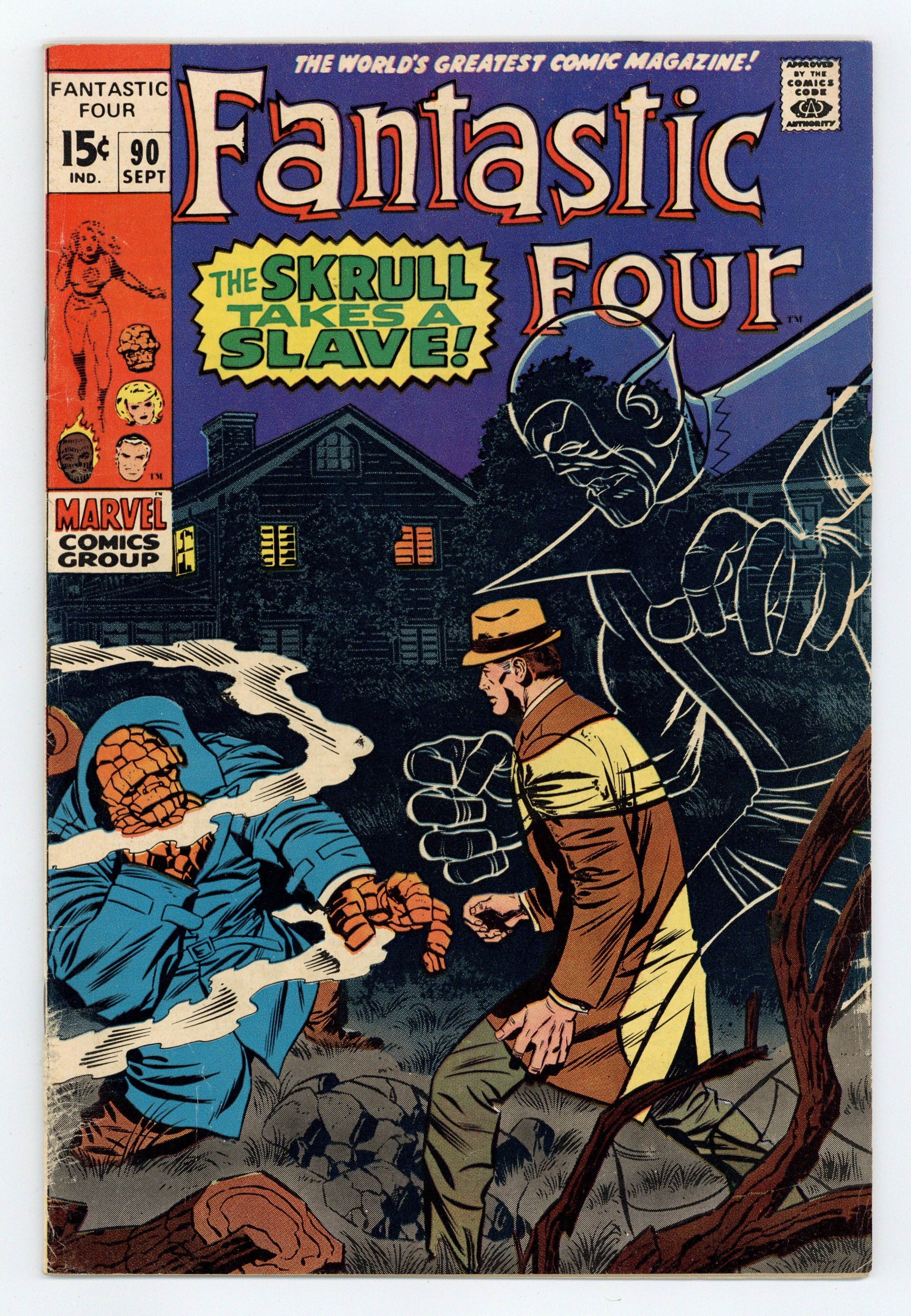 Tags: Fantastic Four$12.50"The Skrull Takes a Slave!" Part 1 of 4. Script by Stan Lee. Pencils by Jack Kirby. Inks by Joe Sinnott. Cover by Jack Kirby and Joe Sinnott. The FF's cataclysmic clash with the Mole Man is over! But danger is still lurking inside the Mole Man's house! When Reed, Ben, and Johnny try to question the Mole Man, the subterranean super-villain escapes and flees to his sub-surface home! However, the fabulous foursome (plus Crystal) have had enough of the Mole Man on this day and elect not to pursue him further. Meanwhile, a sinister skrull lands in New York! What is the alien's malevolent mission? Here's a hint: It involves the blue-eyed idol of millions and a galaxy far, far away! Cameo appearances by Alicia Masters and Franklin. (Note: The Mole Man returns in Incredible Hulk 127 and battles the FF again in Fantastic Four 127.) 36 pages Cover price $0.15.