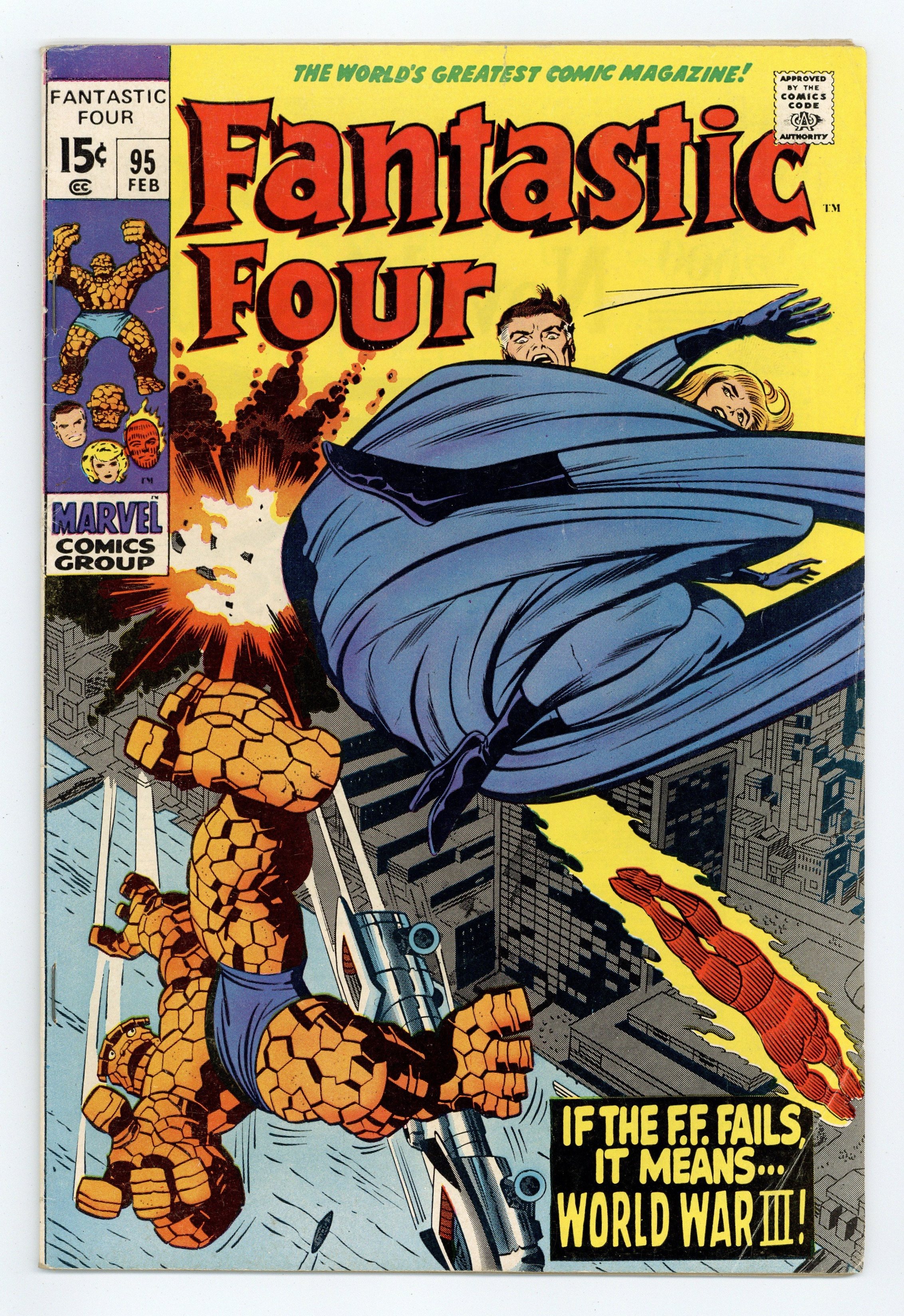 "Tomorrow, World War Three!" Script by Stan Lee. Pencils by Jack Kirby. Inks by Joe Sinnott. Cover by Jack Kirby and Joe Sinnott. A special United Nations delegation visits New York City to promote world peace! And during the foreign group's visit, the Fantastic Four will serve as their designated bodyguards! This should be a simple assignment for Reed, Sue, and Ben given their recent encounters against the Mole Man, Frightful Four, and Skrulls; but a lesson in international espionage is coming their way! A mysterious man called the Monocle stirs up trouble for the FF and puts the world on the verge of global anarchy! Meanwhile inside the Baxter Building trouble is also brewing! However it doesn't involve international affairs…but affairs of the heart. Medusa has come to collect her little sister and return to the Hidden Land. Will Johnny let Crystal go without a fight? First appearance of the Monocle. (Notes: The Monocle returns years later in Fantastic Four 204. This issue includes a full-page ad for Iron Man 22 and Thor 172.) 36 pages Cover price $0.15.