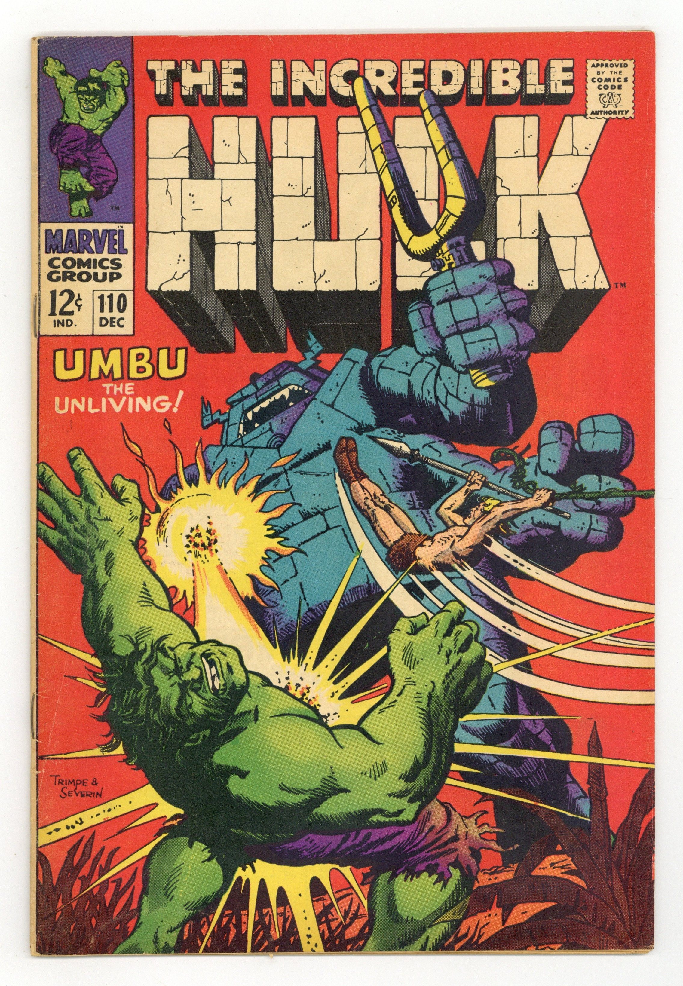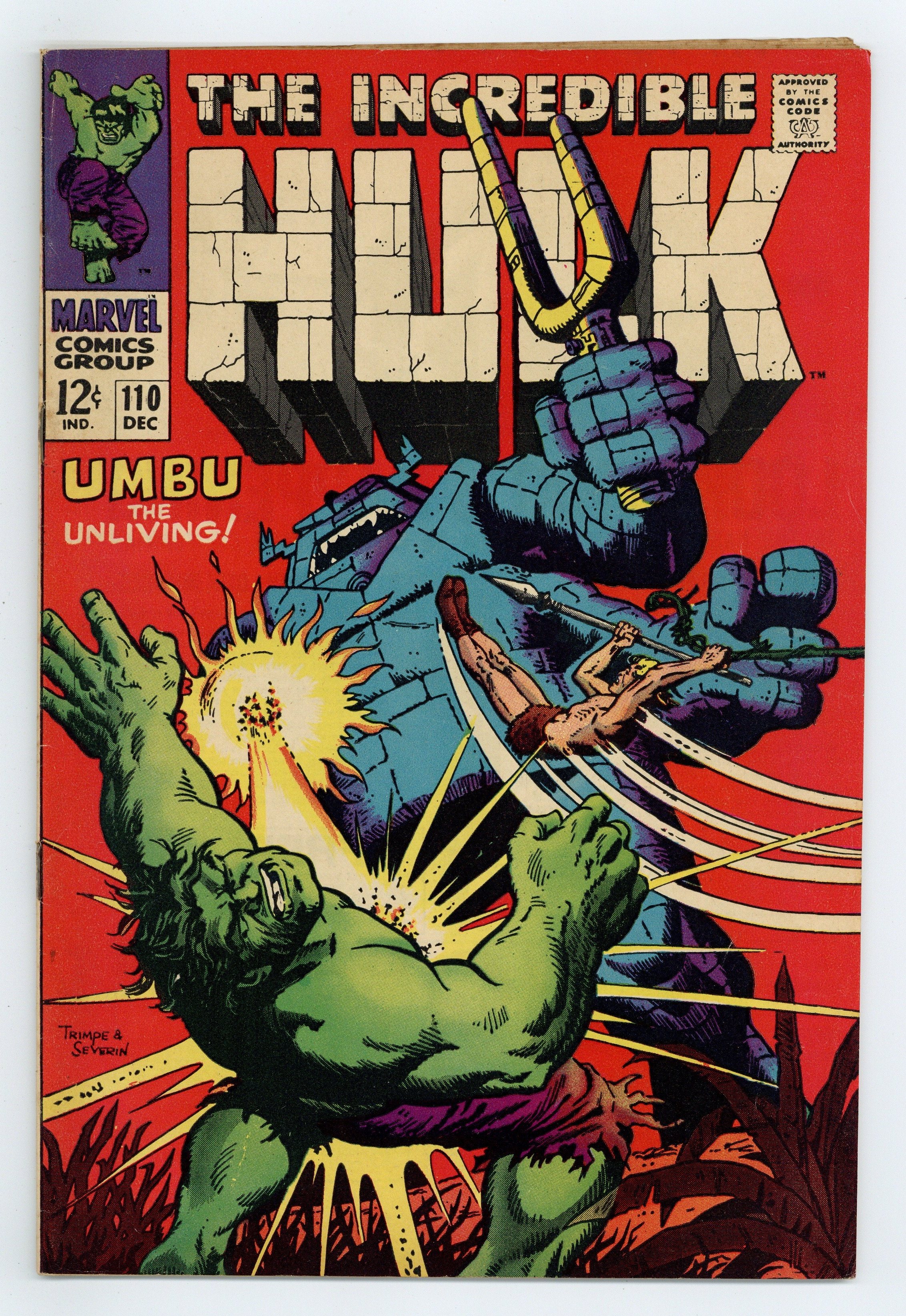 Tags: Marvel Legacy Numbering: Hulk (part 110), Hulk$28.50Cover pencils by Herb Trimpe, inks by John Severin. Umbu, the Unliving!, script by Stan Lee, pencils by Herb Trimpe, inks by John Severin; Ka-Zar and the Hulk battle as the jungle lord tries to figure out a way to get him to turn back into Bruce Banner in time to stop an alien machine from destroying the earth using deadly weather patterns; Ka-Zar is captured and taken by the Swamp Men to be a human sacrifice for the giant creature known as Umbu; Hulk fights Umbu but transforms back into Banner thanks to a fortuitous gas attack; Banner races to stop the mysterious earth destroying machine with Umbu close on his tail and trying to stop him; Banner succeeds but is killed in achieving his victory. 36 pgs. $0.12. Cover price $0.12.