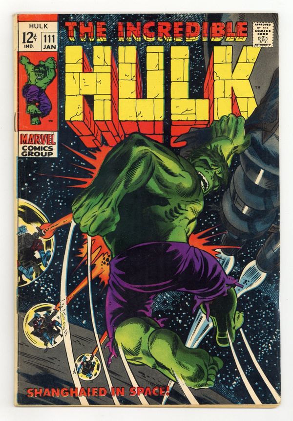 Tags: Marvel Legacy Numbering: Hulk (part 111), Hulk$43.00Cover pencils by Herb Trimpe, inks by Dan Adkins. Shanghaied In Space!, script by Stan Lee, pencils by Herb Trimpe, inks by Dan Adkins; The aliens who sent Umbu to destroy the earth capture Bruce Banner after the Hulk defeats their killer robot; Bringing him back to life (Bruce died at the end of last issue), the aliens find they have their hands full as they wage a pitched space battle with Bruce's alter ego, the incredible Hulk; Making it to their home planet, Hulk finds himself faced with the awesome might of the Galaxy Master. 36 pgs. Cover price $0.12.