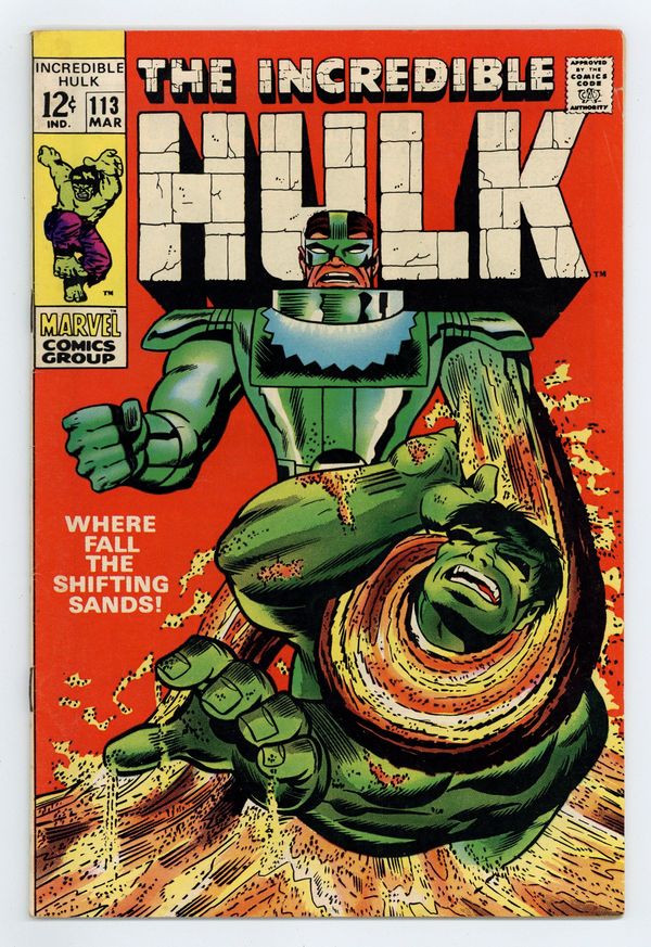 Tags: Marvel Legacy Numbering: Hulk (part 113), Hulk$30.50Cover pencils by Herb Trimpe, inks by Dan Adkins. Where Fall the Shifting Sands?, script by Stan Lee, pencils by Herb Trimpe, inks by Dan Adkins; Bruce Banner, dying on a decompressed rocket ship hurling back to earth, succeeds in turning back to the Hulk and surviving the experience; Once he makes it back to earth, he is accosted by Sandman who easily dupes the Hulk into believing he is his only friend in the world; On his new buddy's instructions, Hulk attacks Ross's missile base as the Sandman uses the diversion to try and steal some military hardware; Finally figuring out that he has been hornswaggled once again, Hulk beats up Sandman but then leaps away before Ross and Betty can tell him they may think he is not that bad a guy after all. 36 pgs. Cover price $0.12.