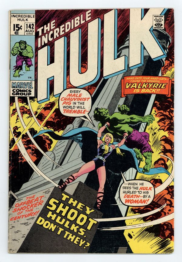 Cover pencils by Herb Trimpe, inks by John Severin. They Shoot Hulks, Don't They?, script by Roy Thomas, pencils by Herb Trimpe, inks by John Severin; The Hulk is the focus of a social event as the Parringtons bring him to a party but their women's lib daughter is given the powers of the Valkyrie by the Enchantress and battles the jade giant. House ad for Conan the Barbarian #8, pencils by Barry Smith. Cameo by author Tom Wolfe. (This story is inspired in part by Wolfe's novel "Radical Chic.") 36 pgs. $0.15. Cover price $0.15.