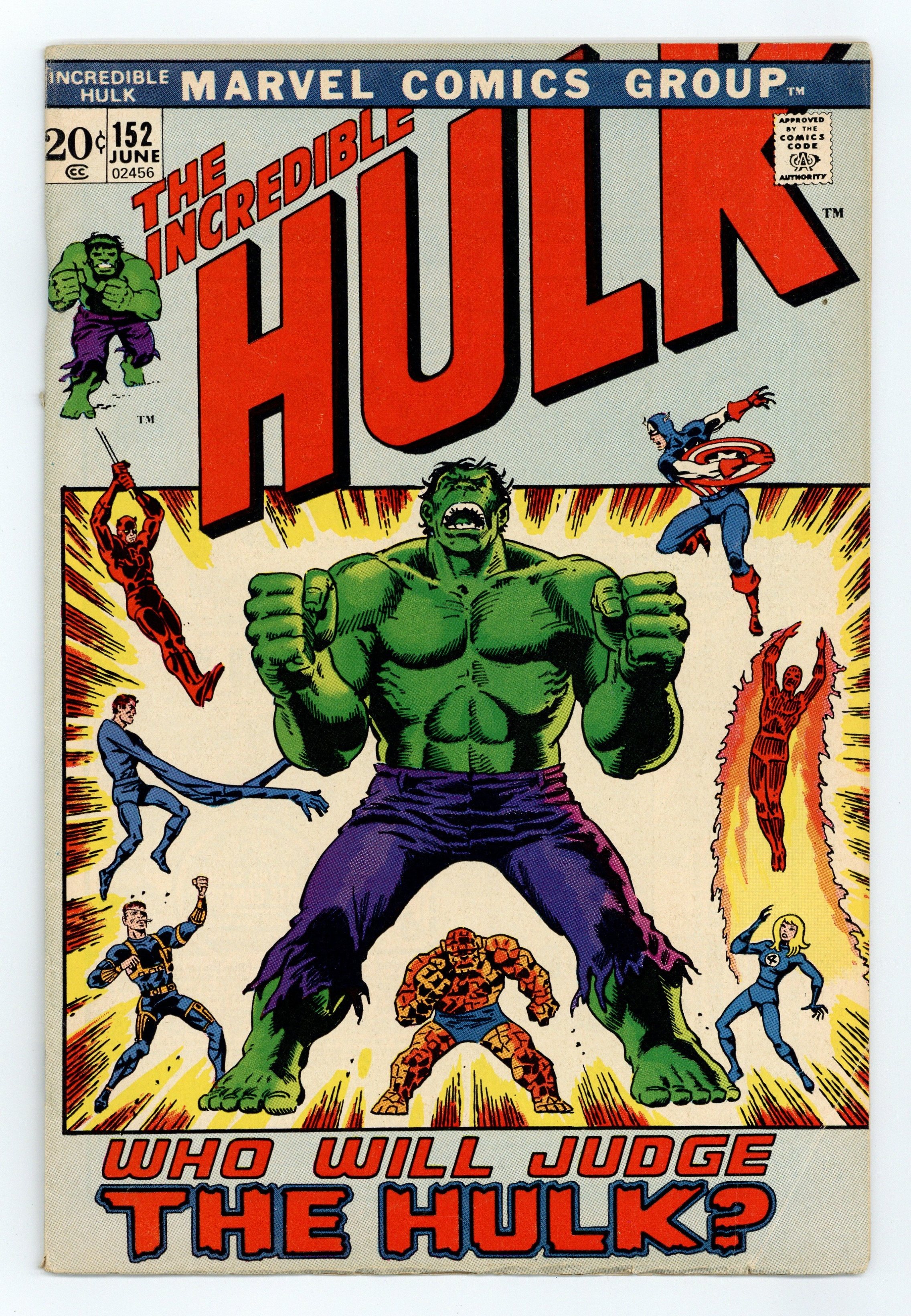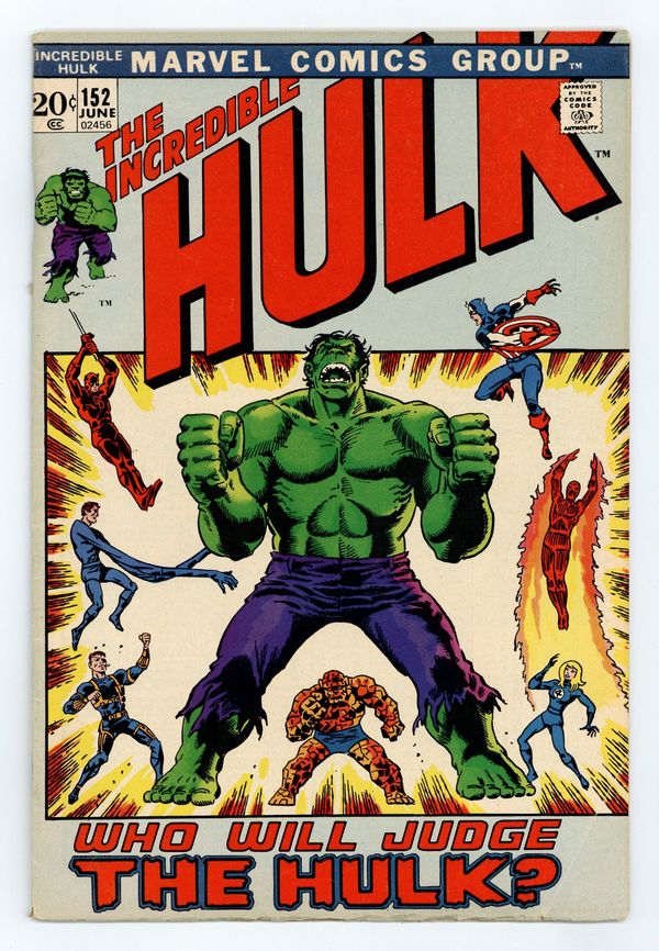 Tags: Marvel Legacy Numbering: Hulk (part 152), Hulk$34.00Cover pencils by Herb Trimpe, inks by John Severin. But Who Will Judge the Hulk?, script by Gary Friedrich and Steve Englehart (uncredited), pencils by Herb Trimpe and Dick Ayers, inks by Frank Giacoia; fter his recent rampage in Washington D.C., the president sends Nick Fury and Cap to help Ross capture the Hulk; They are successful and prepare to transport Bruce to New York to stand trial; During the plane ride, Bruce's lawyer, Matt Murdock, finds him so heavily sedated that he is only able to wallow in guilt and prepare for death; Matt invokes Bruce's civil rights and demands that Ross give him a stimulant so he can talk to his client coherently; Ross reluctantly complies and Bruce quickly turns into the Hulk; Hulk bursts from the plane to find the FF waiting for him on the tarmac of JFK; Guest starring Nick Fury, Captain America, and Matt Murdock (Daredevil), cameos by J. Jonah Jameson, Peter Parker (Spider-Man), the Black Widow, Richard Nixon, and Spiro Agnew. 36 pgs. $0.20. Cover price $0.20.