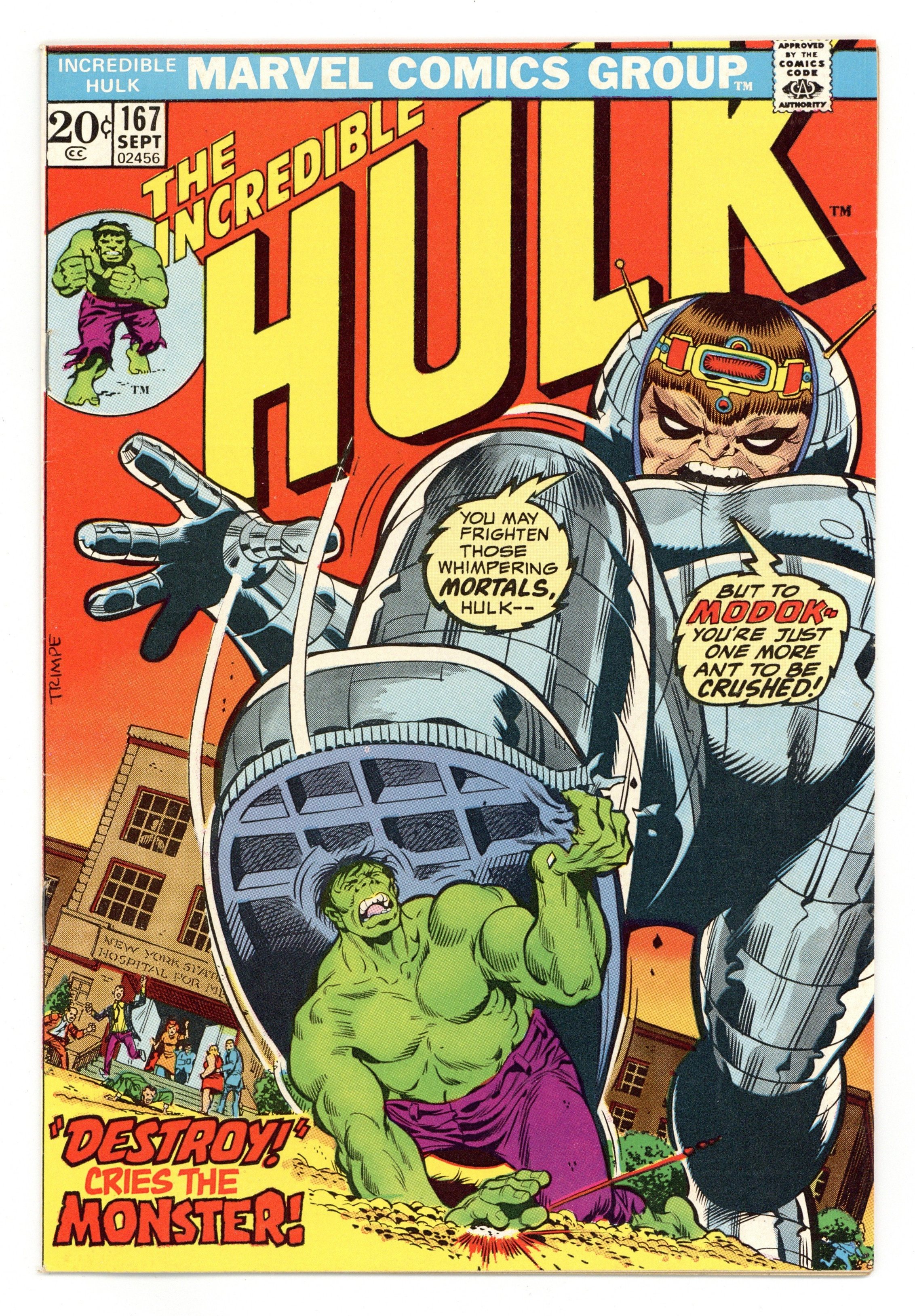 $75.00Cover art by Herb Trimpe. To Destroy the Monster!, script by Steve Englehart, pencils by Herb Trimpe, inks by Jack Abel; Ross returns from Russia and is forced to tell Betty that her husband died saving his life; Betty's mind snaps and she is committed to a sanitarium; Bruce visits Betty to see if he can help but she rants at him as well, beating on him until he turns into the Hulk; Realizing that Betty hates the Hulk, M.O.D.O.K. decides to use her as his instrument of vengeance. The story continues from Defenders 11 and Marvel Feature 11. 36 pgs. $0.20. Cover price $0.20.