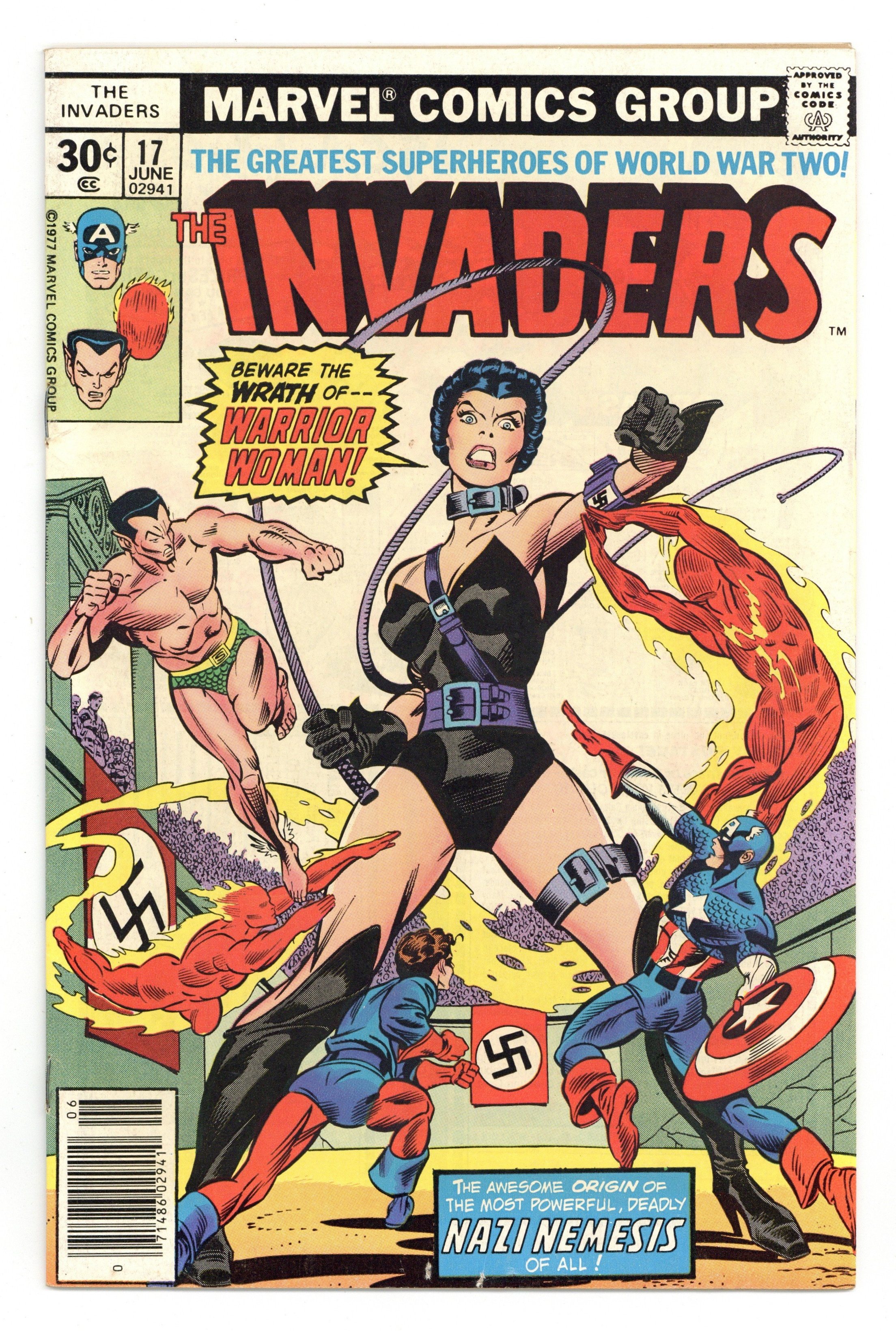 Part 2 of 6 - "The Making of Warrior Woman, 1942!" Written by Roy Thomas. Art by Frank Robbins and Frank Springer. The Invaders are at the mercy of Adolf Hitler and his super powered enforcer, Master man. Plus, the Nazis introduce our heroes to the power of Warrior Woman! 1st appearance of Warrior Woman. 32 pages FC Cover price $0.30.