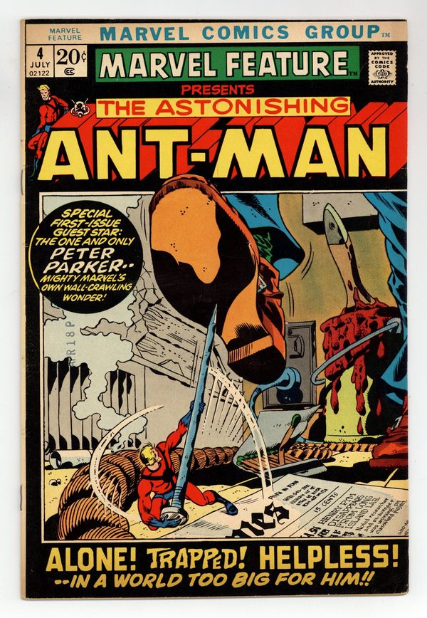 Re-introduction of Ant-Man (1st appearance since 1960s) in "The Incredible Shrinking Doom!" Guest-starring Ant-Man and Peter Parker. Script by Mike Friedrich. Art by Herb Trimpe. Cover by Herb Trimpe. The Ant-Man is back! And working on a new experimental drug with a university research assistant…Peter Parker! But the duo's science project is put on hold when low-life thugs kidnap Billy Connors! The son of fellow researcher, Dr. Curt Connors (aka the Lizard)! Hank and Peter are outraged and vow to save Billy! So Ant-Man, Aunt May's nephew, and Hank's dog, Orkie, embark on a rescue mission to Eagleneck Point! However, these kidnappers are tough and push Hank Pym to the brink! Ant-Man needs help! And fortunately, there's a web-slinger close by! Retelling of Hank Pym's origin. Cameo appearances by Spider-Man and Martha Connors. Flashback cameos by Hawkeye and the Wasp. (Notes: This issue begins a seven-issue run in the Marvel Feature title featuring the Astonishing Ant-Man. These stories took place during Hank Pym's time away from the Avengers in the early 1970's. Ant-Man previously appeared in Incredible Hulk 154.) 32 page Cover price $0.20.